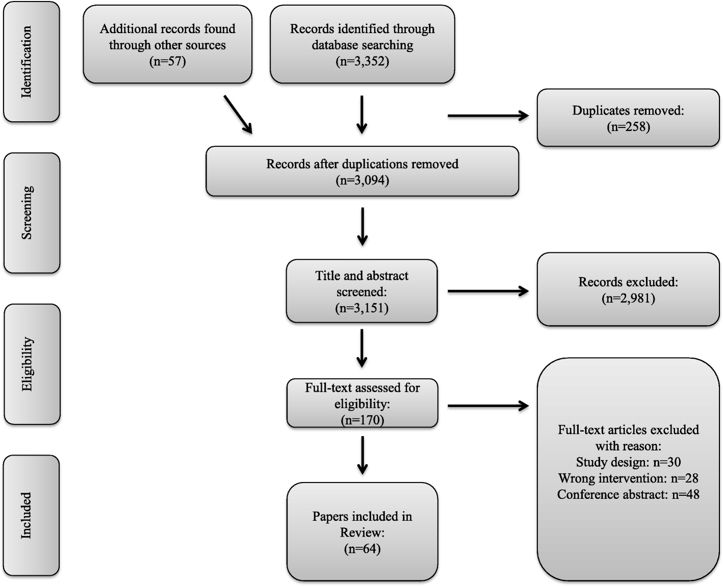 The initial search performed on December 10th, 2017, generated a total of 2207 publications, and the additional search on February 13th, 2021, added to a total number of 3352. Additional 57 articles were full-text screened after being identified through hand search of reference lists. Of the total of 3409 articles 170 were full-text screened. The full text screening resulted in a total of 64 included articles. Study flow of article identification and selection is shown in Fig. 1.