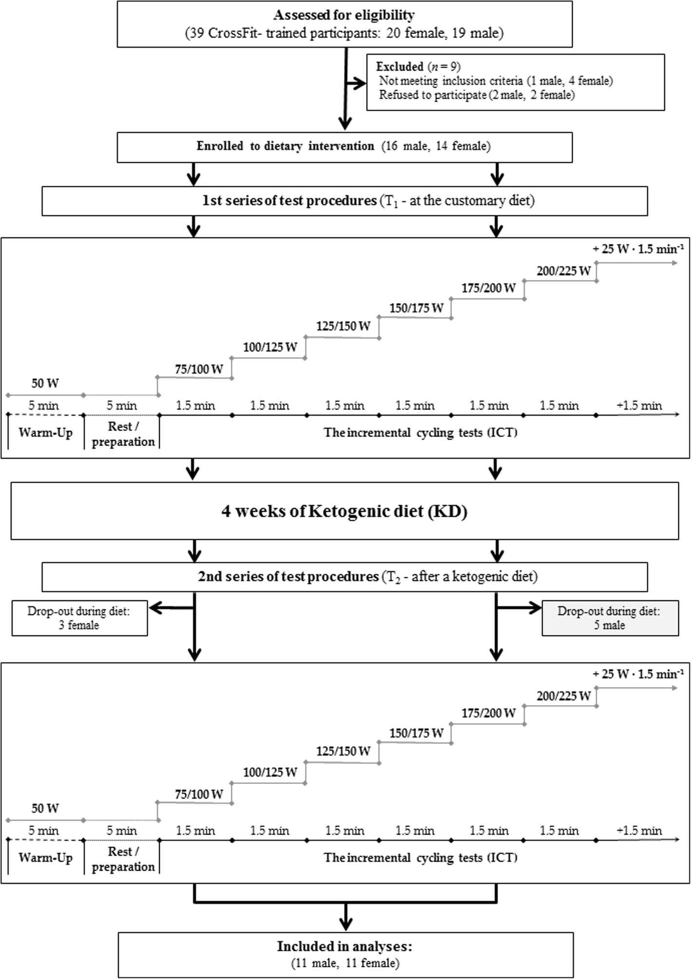 Thirty participants were initially enrolled in this study. However, 22 (11 women, 11 men; mean ± SD: age 29.5 ± 4.4 years, body height 172 ± 8 cm, baseline values of body mass 71.1 ± 12.8 kg, and maximal oxygen uptake 45.8 ± 7.5 mL·min− 1 kg− 1) completed the entire study protocol and were included in the analyses (Fig. 1, Table 1). The participants were recreationally and regularly training for CrossFit at the Caffeine Barbell, Hangar, Reebok CrossFit Poznań and Rankor Athletics clubs in Poznań, Poland. The criteria for qualifying for the study, included being aged from 18 to 40 years, in good health with a valid and up-to-date medical certificate confirming the athlete’s ability to practice sports, at least 2 years of regular CrossFit training experience, and a minimum of 4 workout sessions (CrossFit) per week. We included both males and females because of the equal participation of both genders in CrossFit training, as well as because of the willingness to assess whether the KD has an impact related to the gender of the subjects undergoing this type of training.