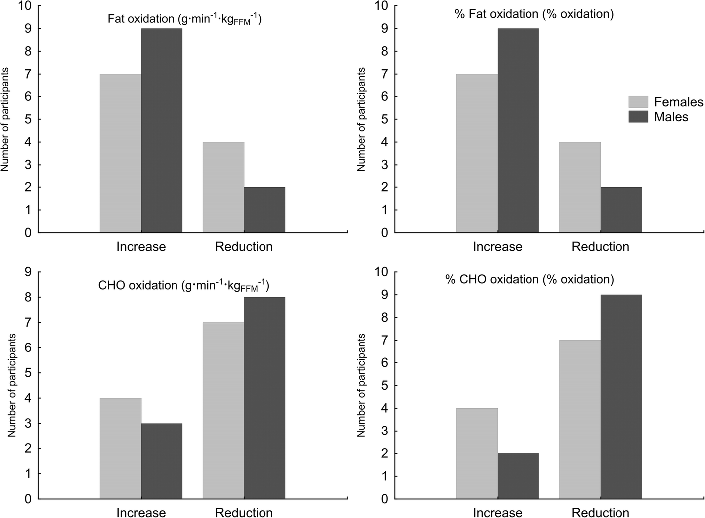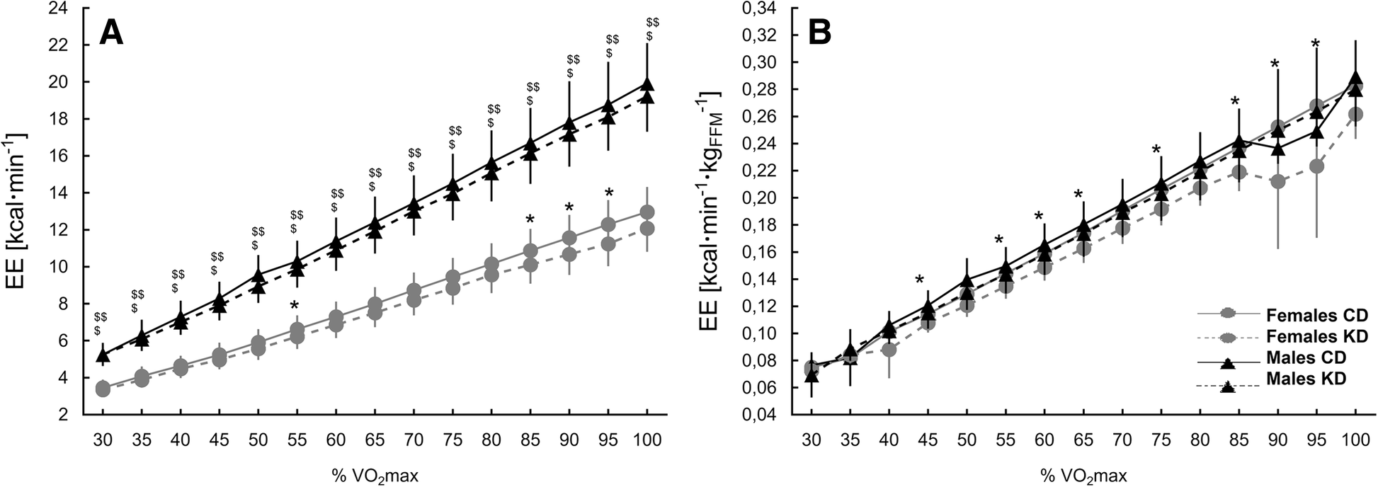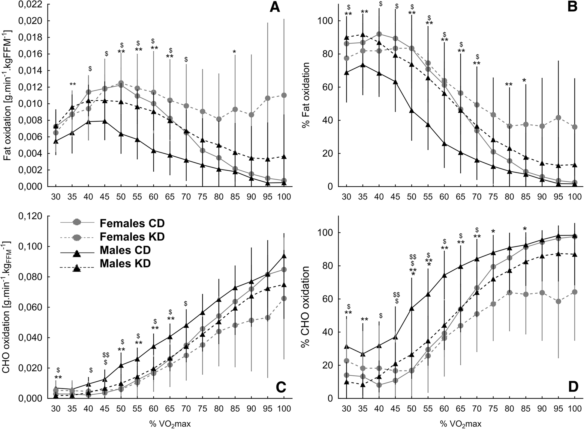 In males, the KD led to an increase in fat utilization (g·min− 1·kgFFM− 1 and % oxidation). It was particularly noticeable at exercise intensities up to 80% of VO2max. An increase in the area under the curve (AUC) was seen in males but not in females at up to ≤65% VO2max of fat utilization.