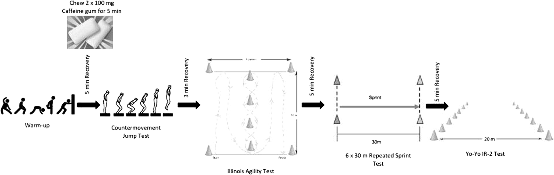 In a double-blind, randomized, placebo-controlled, crossover design, 17 male university-standard rugby players (mass: 85.6 ± 6.3 kg; height: 179.4 ± 6.2 cm; age: 20.4 ± 1.2 years) chewed caffeinated gum (200 mg caffeine) or a placebo gum on two occasions separated by a week. After a standardized warm-up, gum was chewed for 5 min. Subsequently, participants performed three countermovement jumps, followed by an Illinois agility test, 6 × 30 m repeated sprints, and the Yo-Yo IR-2 test; each test was separated by short rest periods.