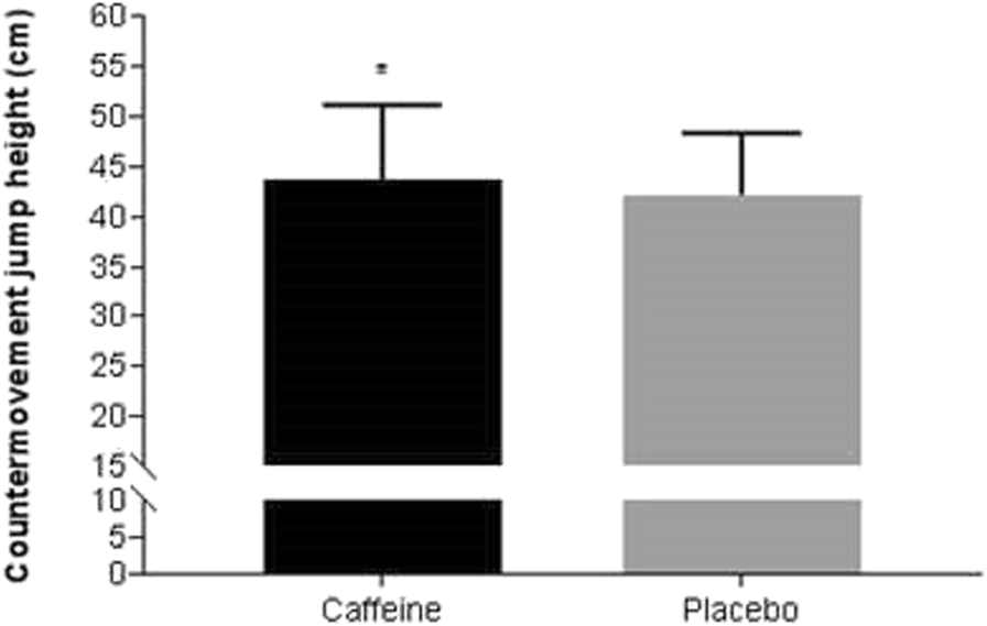 Countermovement jump height (n = 17). Data are expressed in mean ± SD. * Caffeine significantly higher than placebo (p = 0.044)
