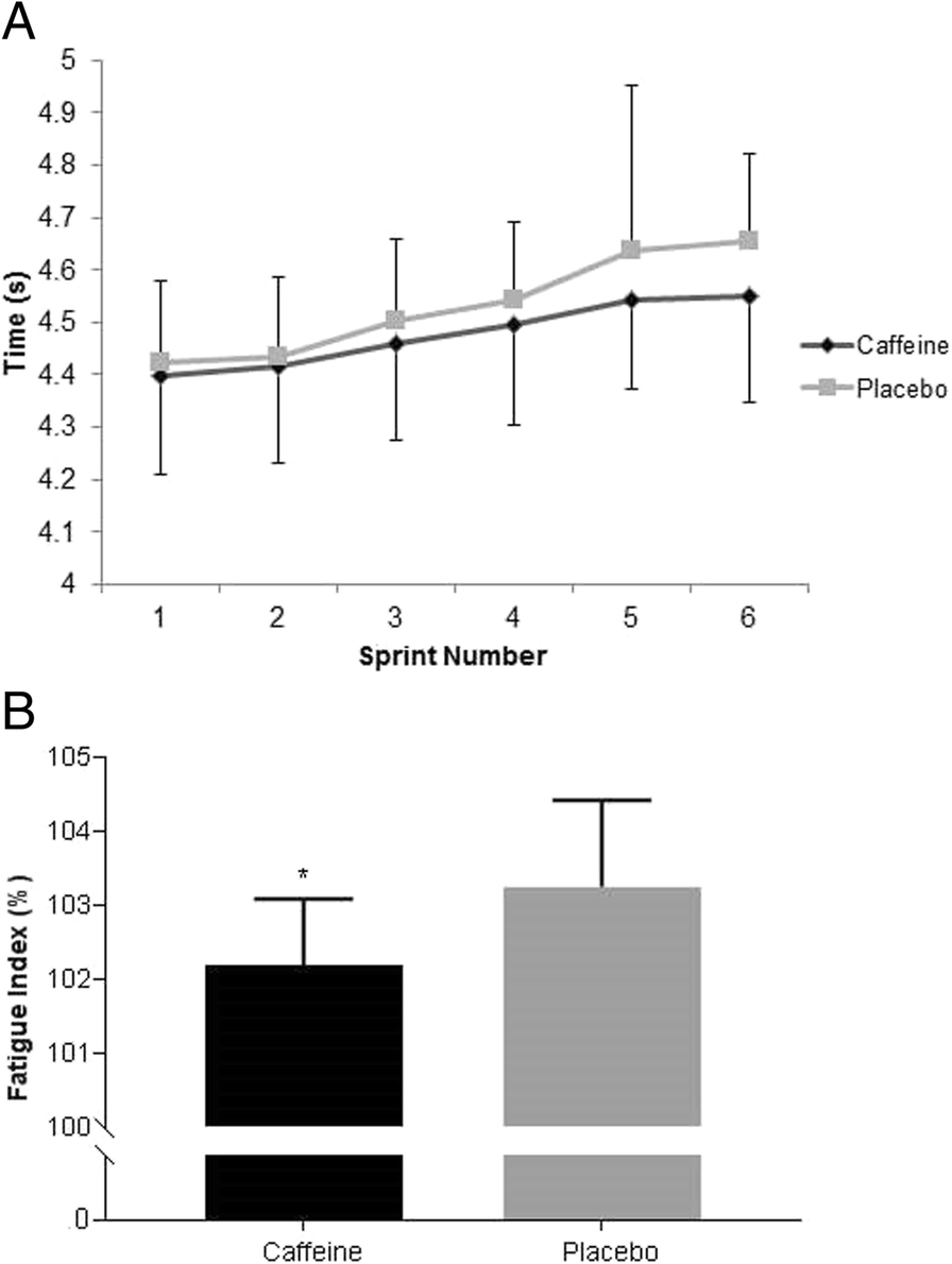 (a) 6 × 30 m sprint times (n = 17). Data are expressed in mean ± SD. b Fatigue Index (n = 17). Data are expressed in mean ± SD. * Caffeine significantly lower than placebo (p = 0.001)