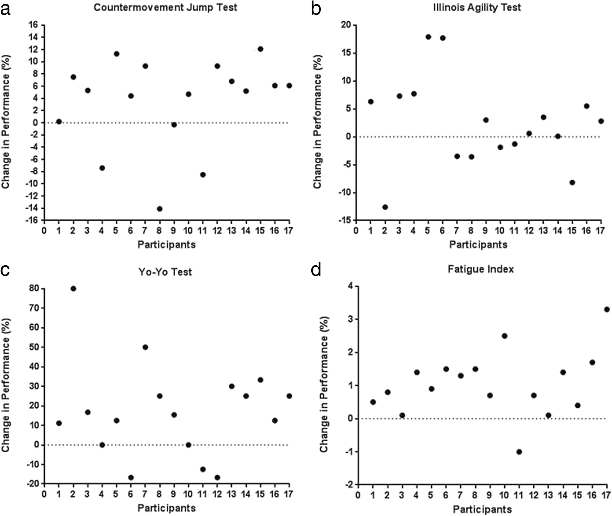 Individual responses to caffeine gum supplementation on the battery of tests (n = 17). expressed in percentage change from baseline. a - Countermovement Jump Test; b - Illinois Agility Test; c - Yo-Yo Test; d - Fatigue Index