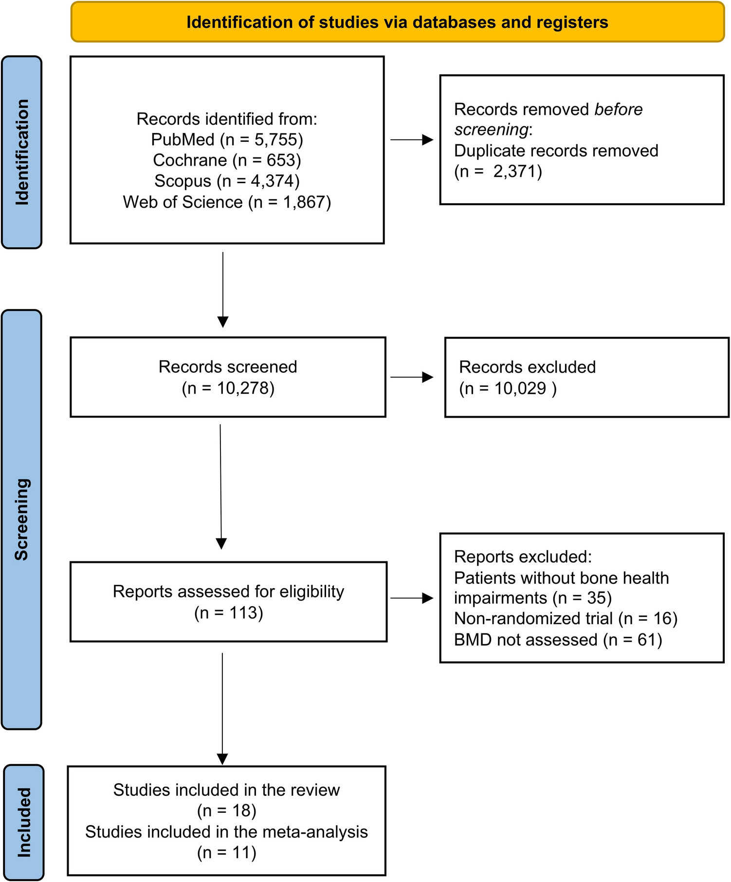 Ashem et al. [29] Three arms RCT | Egypt | 30 pts (15 pts Ex; 15 pts Con) with breast cancer; menopausal status NR | 100% pts with osteopenia treated with vitamin D, calcium, and bisphosphonates | Age: Ex = 53.9 ± 6.9; Con = 56.7 ± 5.3 BMI: Ex = 28.9 ± 0.5; Con = 28.5 ± 1.2 Gender: female (100%) | Hormone therapy (NR% in Ex; NR% in Con) | DEXA scan: lumbar spine BMD |