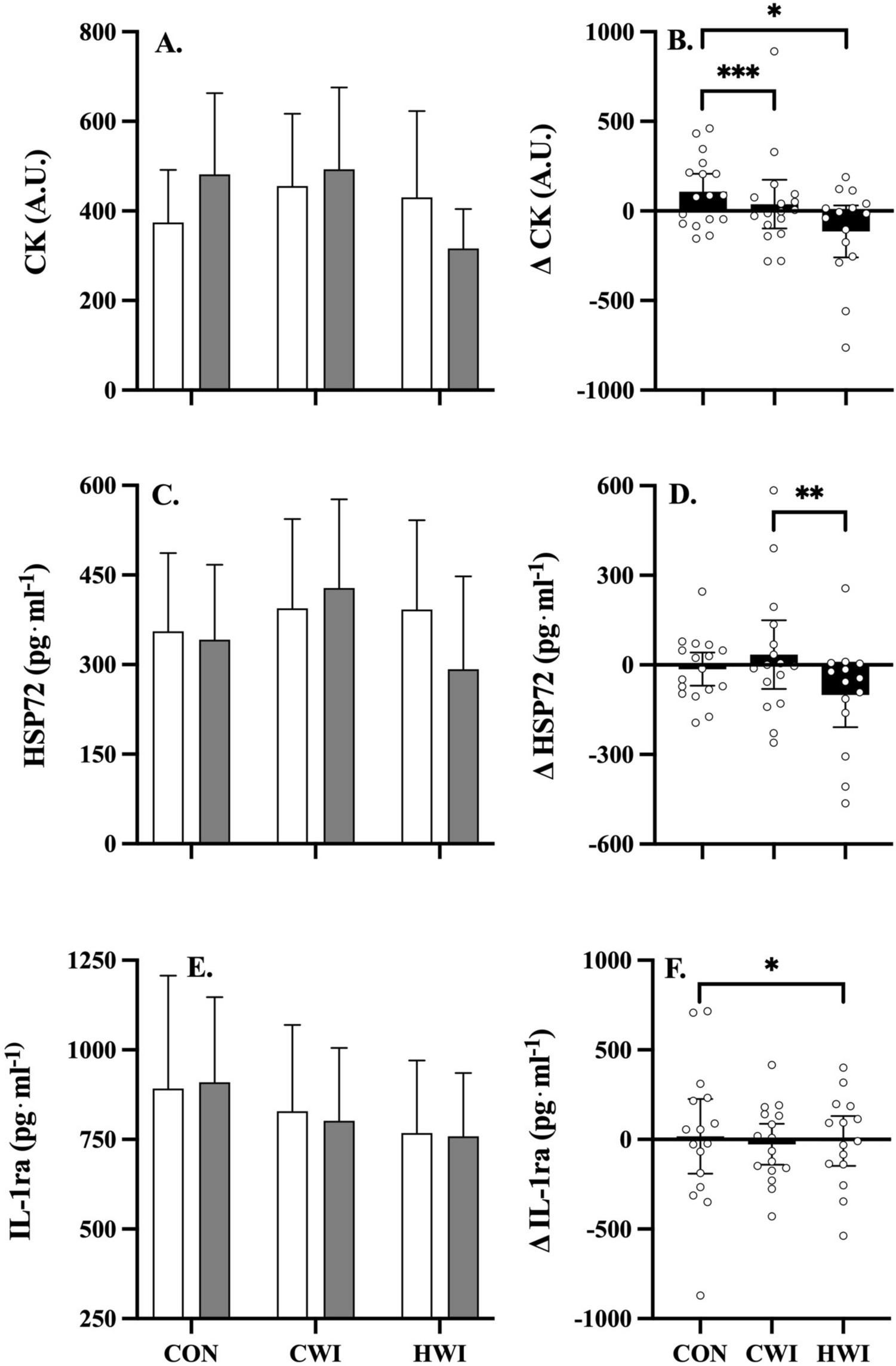 2021). In our study, the CON group displayed significantly higher muscle damage (i.e., CK), which may be a reason for the elevated IL-1ra when blood testing occurred ~ 36-h after the last session. Similarly, elevated core temperature (~ 39.5 °C) in mice has previously been associated with increased circulating IL-1 levels, providing accelerated recovery and adaptive responses (Dinarello