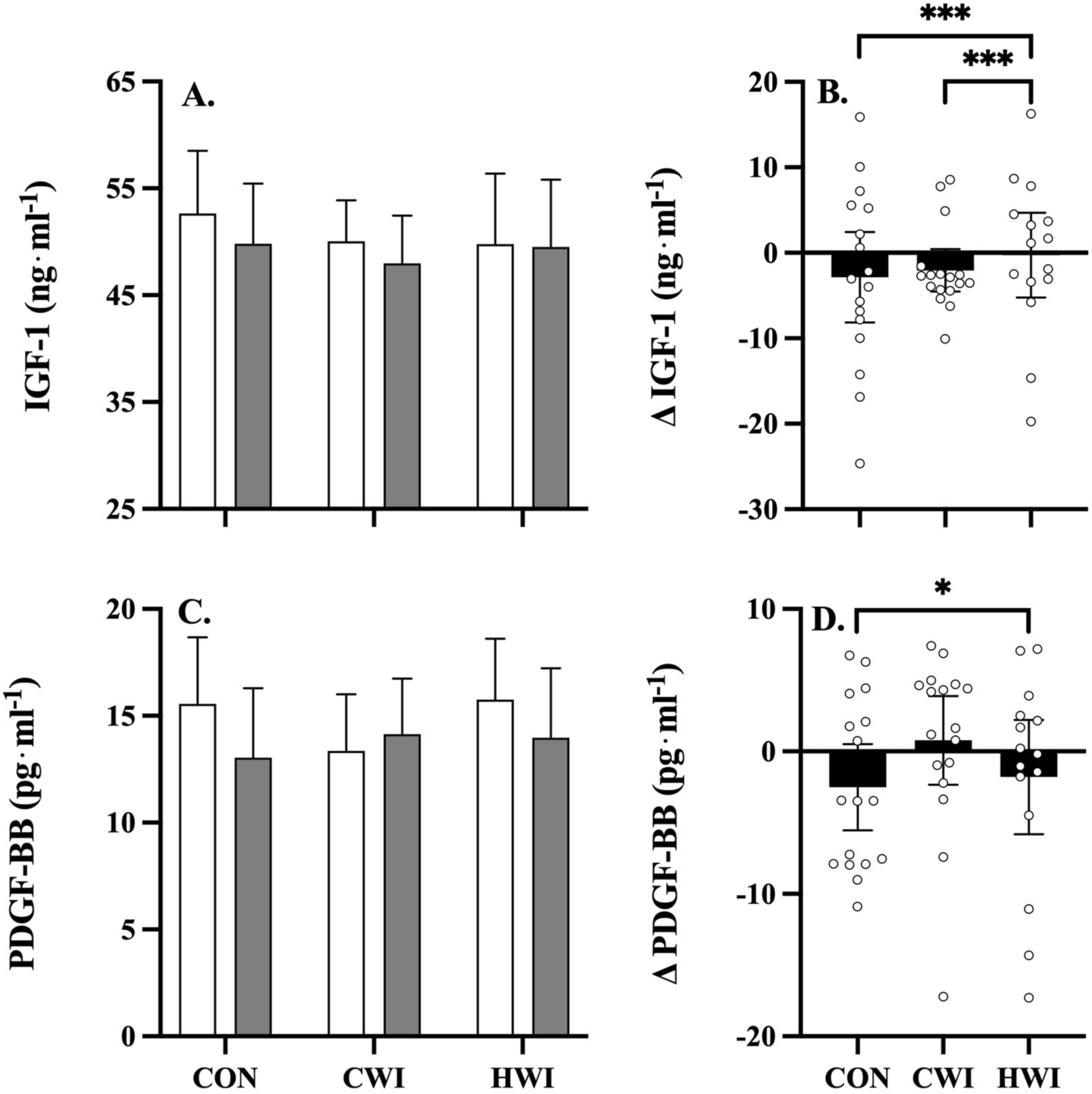 Post-resistance exercise HWI resulted in trivial increases in IGF-1, compared to CWI or CON strategies, while post-resistance exercise HWI resulted in trivial increases in PDGF-BB, compared to CON. The authors are not aware of any research investigating post-resistance exercise CWI versus HWI in athletes on chronic systemic growth factor responses. Synergistic effects of IGF-1 and PDGF-BB have been reported to provide therapeutic anti-inflammatory osteoarthritic benefits (Montaseri et al.
