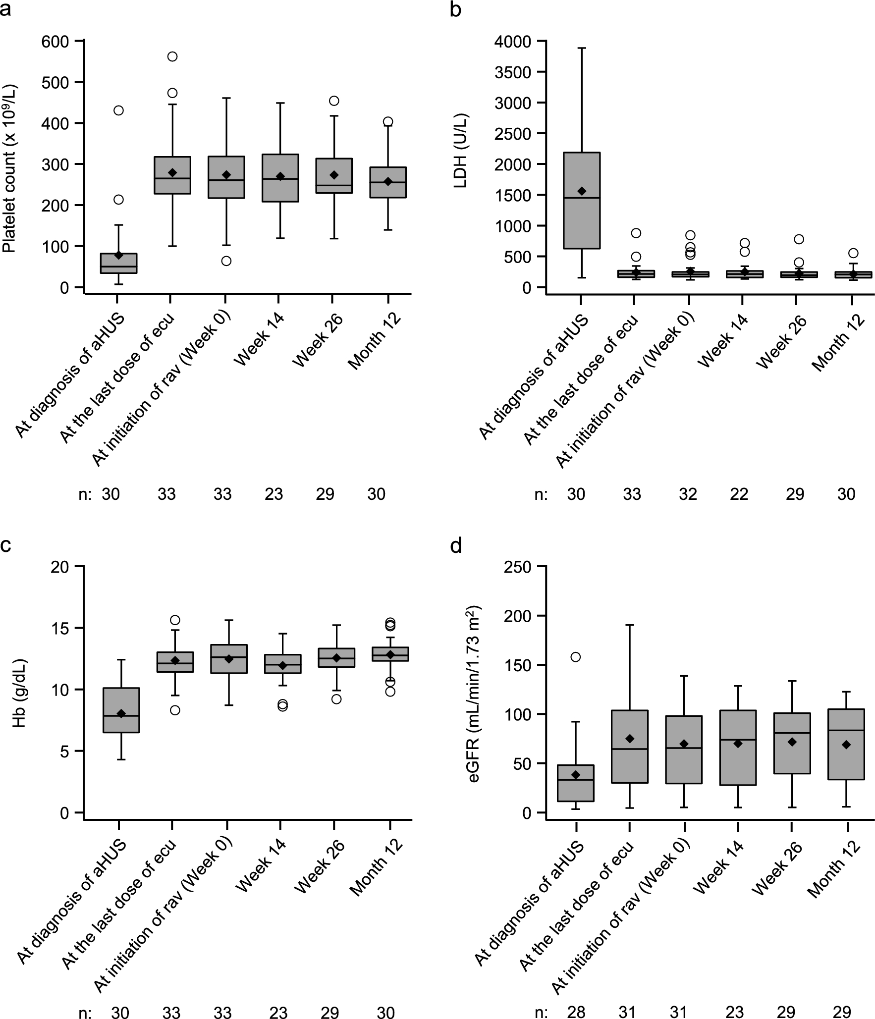 The effectiveness endpoints were TMA event-free status, changes in hematologic and renal parameters including platelet (PLT) count, lactate dehydrogenase (LDH), hemoglobin and estimated glomerular filtration rate (eGFR), and dialysis status. TMA event-free status was defined as no decrease in PLT count > 25%, no decrease in PLT count to < 150 × 109/L, no plasma exchange or infusion, and no initiation of dialysis, which was assessed at Weeks 14 and 26 and at Month 12 from the start of ravulizumab administration.
