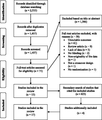 Studies were excluded from the analysis if any of the above criteria were violated. Caffeine ingestion via coffee was not considered as coffee has several other biologically active compounds that might moderate the impact of caffeine.
