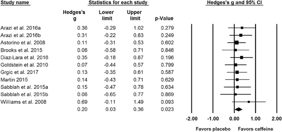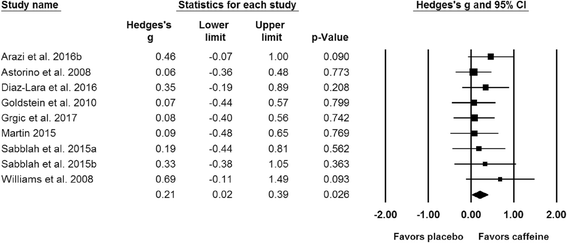 Forest plot showing differences between the effects of placebo and caffeine trials on measures of muscle power expressed as vertical jump height. The size of the plotted squares reflects the relative statistical weight of each study. The numbers on the x-axis denote the standardized mean differences expressed as Hedge’s g. The horizontal lines denote the respective 95% confidence intervals (CI)