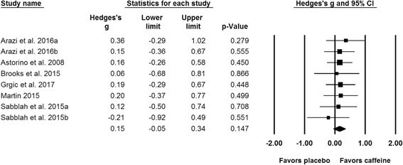 Forest plot showing differences between the effects of placebo and caffeine trials on measures of maximal muscular strength. The size of the plotted squares reflects the relative statistical weight of each study. The numbers on the x-axis denote the standardized mean differences expressed as Hedge’s g. The horizontal lines denote the respective 95% confidence intervals (CI)
