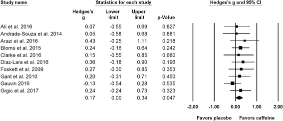 The meta-analysis performed for muscle power indicated a significant difference (SMD = 0.17; 95% CI: 0.00, 0.34; p = 0.047) between the placebo and caffeine trials (Fig. 5). Results from all of the subgroup analysis can be found in Table 2.
