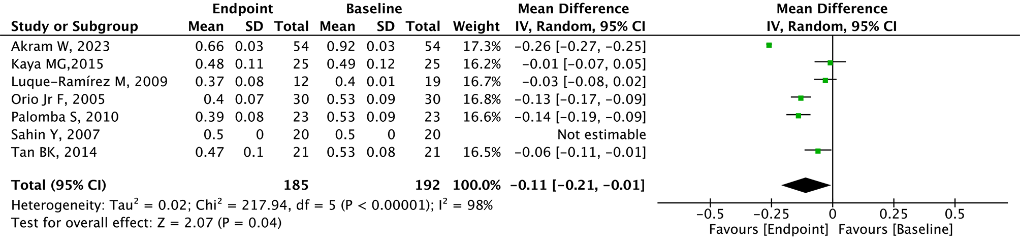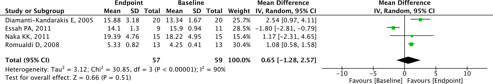 Statistical analyses of study outcomes were performed and pooled as forest plots by RevMan 5.4. For continuous outcomes, mean difference (MD) with 95% confidence interval (CI) was used to represent the effect size of pooled results. As for CIMT, MD < 0 indicated a potential beneficial effect of metformin for patients with PCOS, while MD > 0 implied the opposite. As for FMD and NMD, MD > 0 suggested metformin may have a beneficial effect for PCOS patients, while MD < 0 implied the opposite. Chi-square Q test and I2 statistic were used to assess statistical heterogeneity. I2 < 30% revealed low heterogeneity, 30% ≤ I2 ≤ 60% indicated moderate heterogeneity, and I2 > 60% represented high heterogeneity. Due to the clinical heterogeneity from the diversity of study type and difference in intervention, the random-effects model was used to improve statistical reliability. All reported P-values were two-sided and statistically significant when P < 0.05.