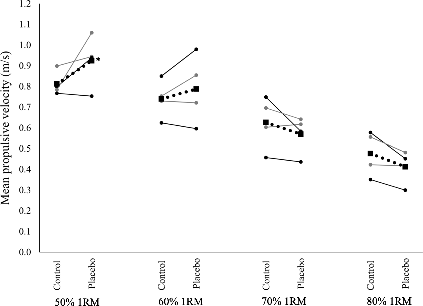 34]. Moreover, considering that the tests involved highly trained athletes, the differences might be relevant to training and competition. It is important to note that, whilst they did not reach significance, the differences with higher loads occurred in the opposite direction, with a trend for a detrimental effect with placebo. The reason for this is not known, but there are two hypotheses to consider. First, the tests were incremental, so it might be possible that the higher performance in the earlier sets with lower loads lead to fatigue in the later sets, performed with higher loads. Second, when the load increased and becomes more challenging, the participants might have expected to have an improved performance perform. However, since there was not physiologic enhancement due to the supplementation, a negative psychological influence might have occurred.