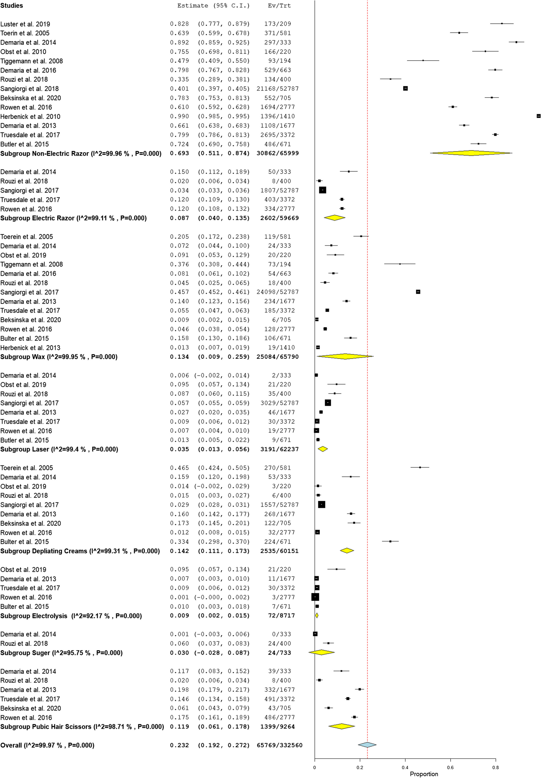 21 | Beksinska et al | 2020 | Cross-sectional study | 1211 | 705 (58.2) | 506 (41.8) | South Africa | 2017–2018 | Women aged 16 to 35 years. All were tested for STIs | PHR* using one or more depilatory methods | The practice of PHR* is common among in KwaZulu-Natal, South Africa population with association of high reporting of side effects as injuries.These injuries could put women at a higher risk of STIs | Non-electric blade razors | Itching, pimples, blisters, rash, bleeding, burns and STI (STI (C. trachomatis or N. gonorrhea or HSV2) |