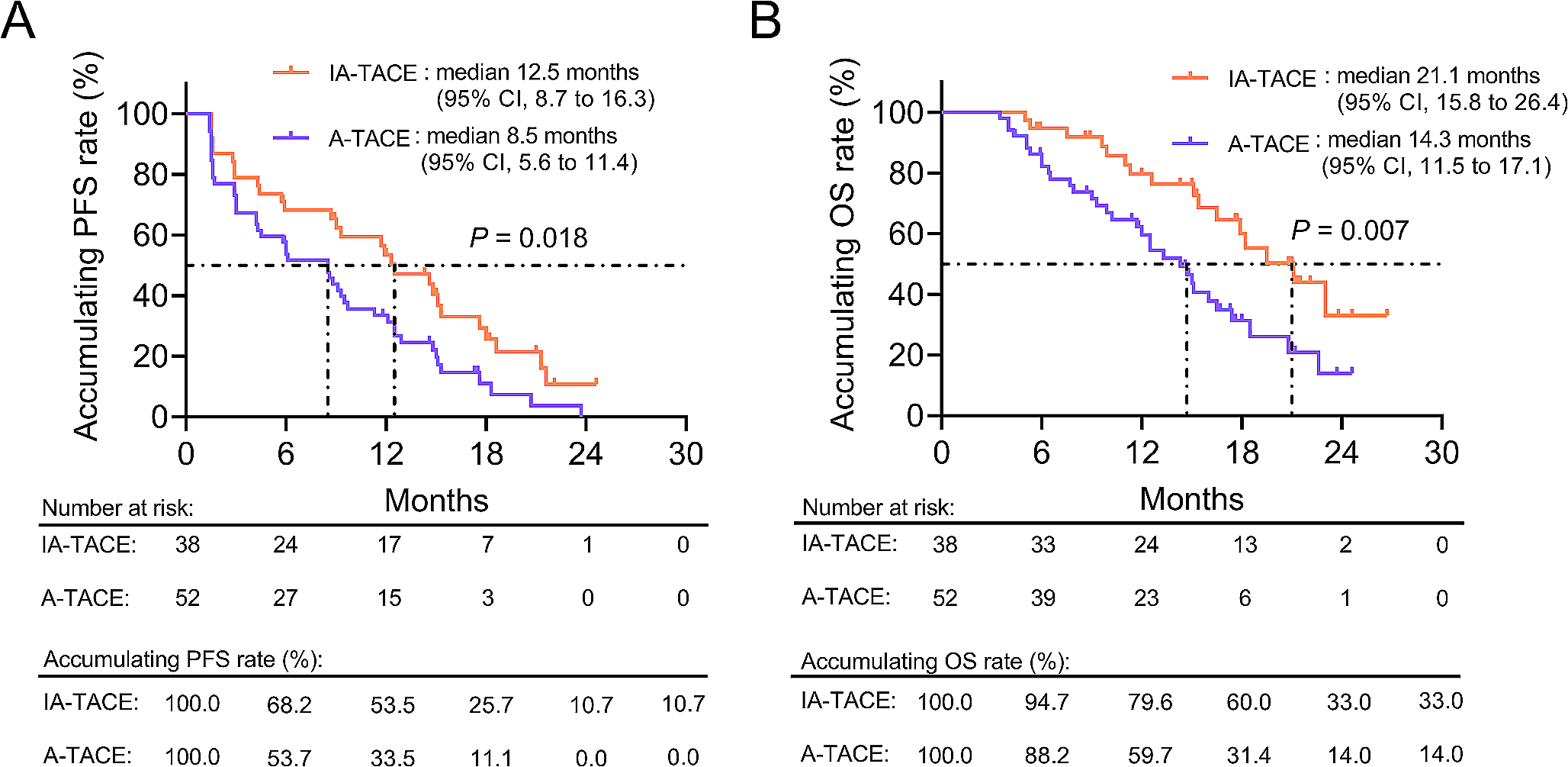 2023). Meanwhile, our study also revealed that PFS and OS were both improved in IA-TACE group compared with A-TACE group, which was also in line with previous studies (Zhu et al.