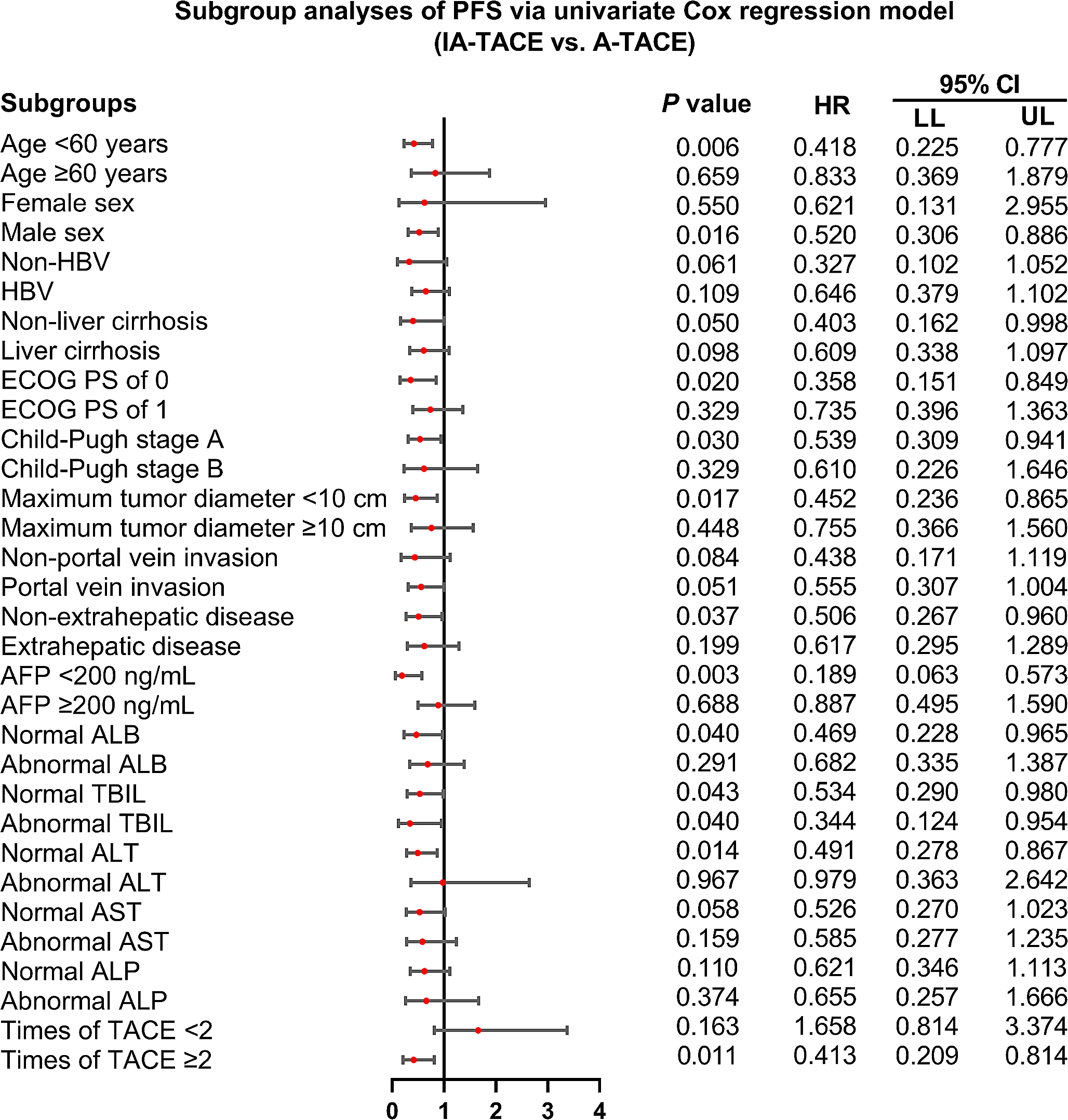 Continuous characteristics were compared using the Mann-Whitney U test or independent-sample T-test, and categorical characteristics were compared via the χ2 test or Fisher’s exact test between groups. The accumulating PFS rate and accumulating OS rate were graphed by the Kaplan-Meier method, in which the Log-rank test was utilized to compare those rates between groups. To identify factors related to PFS and OS, univariate and backward-multivariate Cox regression models were conducted. The univariate Cox regression model was also used to compare PFS or OS between patients who received IA-TACE and A-TACE in different subgroups. Data analyses were performed by SPSS v.26.0 (IBM, America). Statistical significance was considered to be achieved when the P < 0.05 (two-sided).