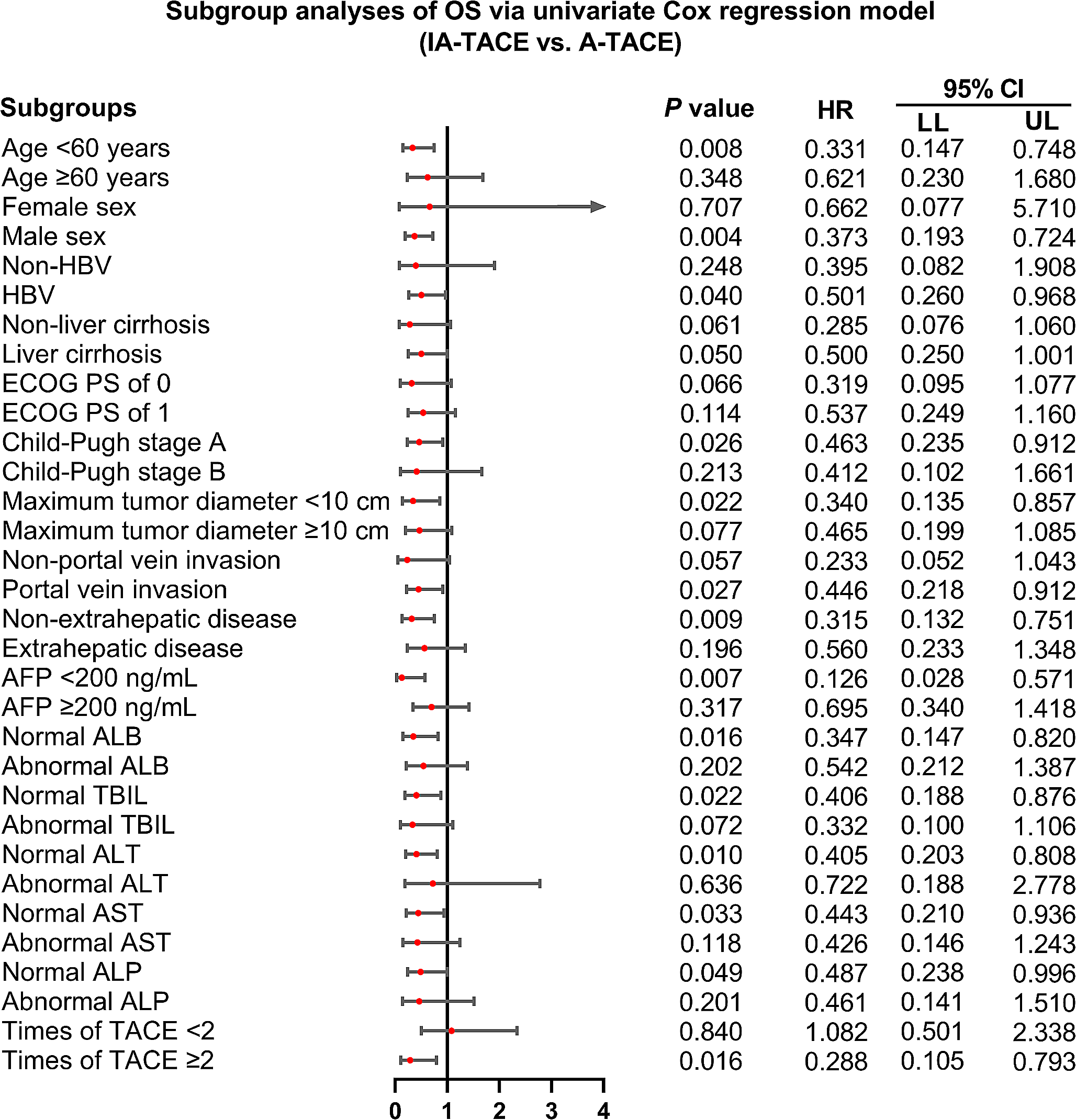 2018); (ii) adult patients (≥ 18 years old); (iii) Child-Pugh stage of A or B; (iv) Eastern Cooperative Oncology Group performance status (ECOG PS) of 0 to 1; (v) Barcelona Clinic Liver Cancer (BCLC) stage of C; (vi) received at least one cycle of IA-TACE or A-TACE treatment; (vii) had at least one available data of best response by Modified Response Evaluation Criteria in Solid Tumors (mRECIST) guideline (Lencioni and Llovet