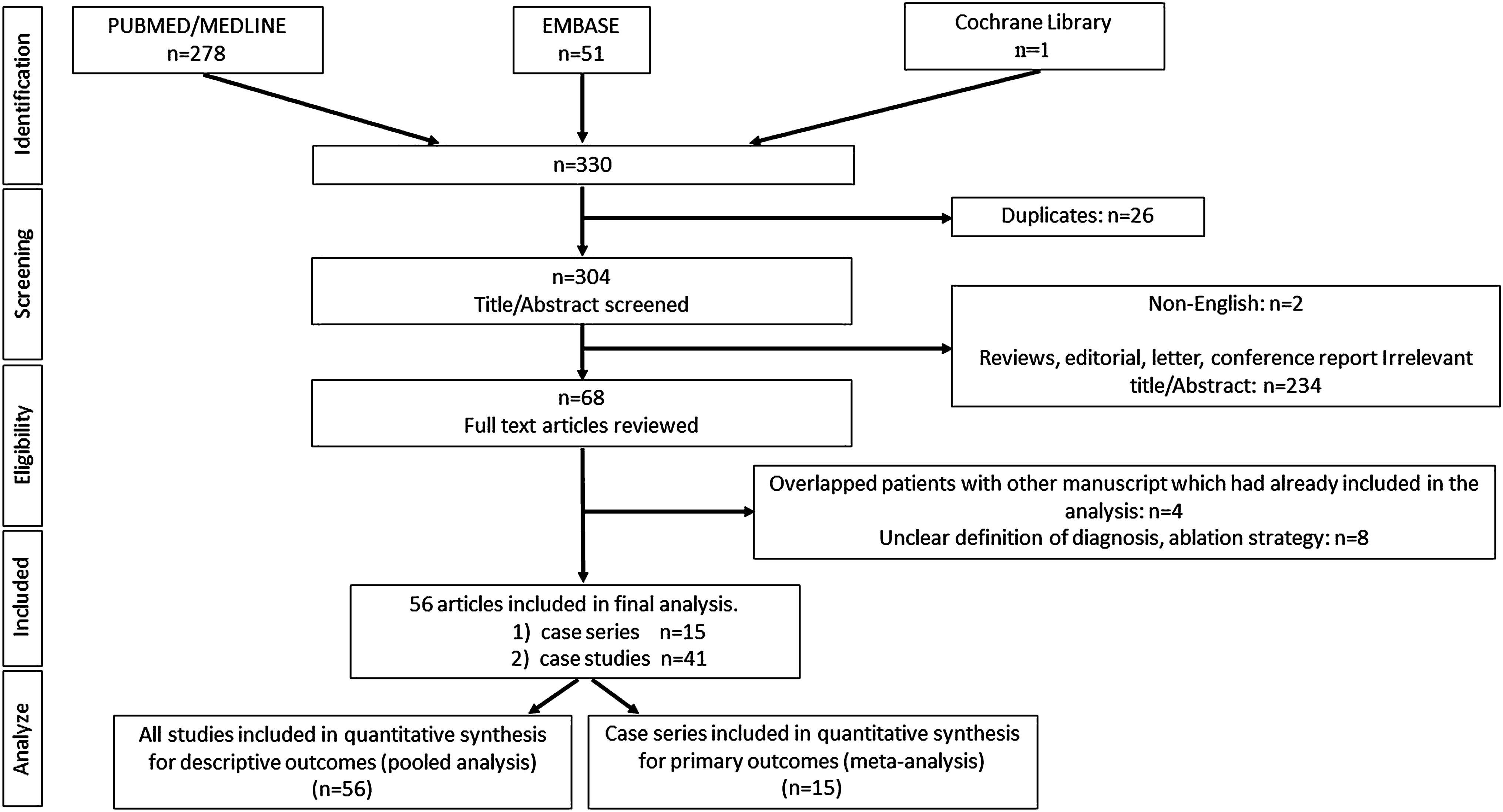 This systematic review was registered in PROSPERO (registration number: CRD42021267328). Pubmed/Medline, EMBASE, and Cochrane Central Register of Controlled Trials databases from inception to 11th of August 2021 were systematically searched to identify all relevant studies. The search terms used were “Brugada syndrome” and “Ablation”. No language restriction was applied at the beginning, however only articles in English were included in the final analysis. The reference list of all identified articles was also reviewed for relevant publications fitting the eligibility criteria. No restriction was applied to the publication date or the age of participants in each study. Due to the paucity of published data on catheter ablation of BrS, we included case reports in the present review.