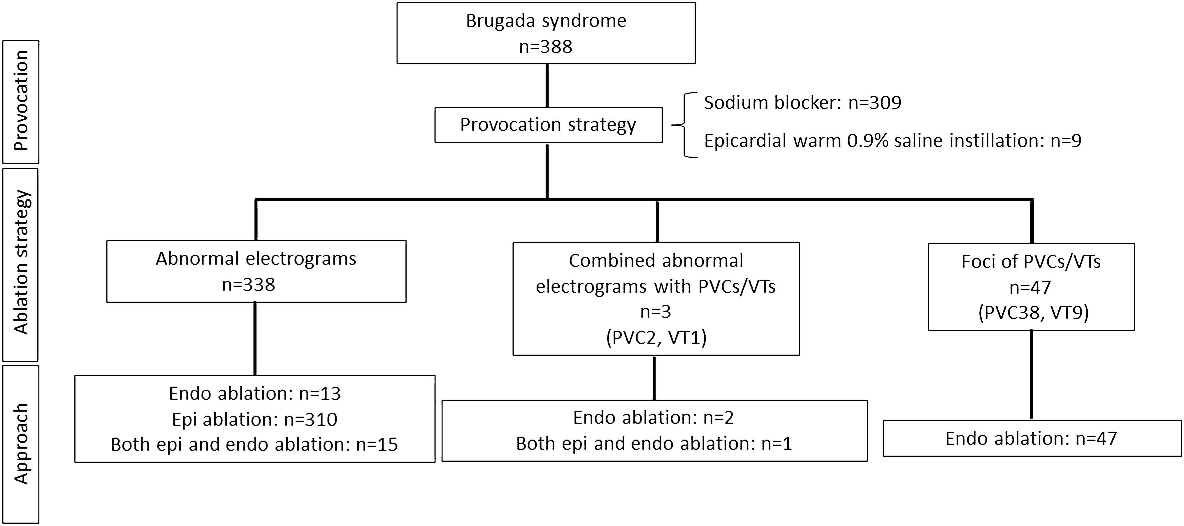12]. In almost all cases, provocation revealed a significant increase in abnormal substrate. Furthermore, the same pharmacological provocation could be used to test the efficacy of catheter ablation, where re-testing revealed abolishment of targeted substrate. An important point to note is that the definition of “abnormal substrate” encompassed both abnormal low bipolar voltage (< 1.5 mV) as well as late potential and fractionated potentials and low frequency (up to 100 Hz) prolonged duration (> 200 ms) bipolar signals with delayed activity extending beyond the end of QRS complex, which could be present in a low voltage area. These differing definitions of abnormal substrate are thematically consistent with the fiercely debated pathophysiologic mechanism of BrS, which is thought to be due to depolarization and/or repolarization abnormalities. It is considered that low bipolar voltage may reflect depolarization abnormalities and low-frequency, prolonged duration signals may reflect repolarization abnormalities. Although the underlying pathophysiology of BrS remains controversial, nevertheless, the provocation strategy is thought to be effective for both definitions of abnormal substrate as provocation showed a significant increase of abnormal substrate area not only low voltage area, but also slow conduction area in previous studies, with excellent procedural outcomes with targeting of substrate with catheter ablation. Ajmaline was the most frequently used for provocation drug in this pooled analysis. It is unclear which sodium channel blocker is the optimal drug, at the most appropriate dose. Further studies will be required to elucidate the optimal provocation strategy. A combined epicardial and endocardial approach might be required with sodium channel blocker augmentation, in addition to PVC and VT ablation where VF triggering PVCs and VTs have been identified.