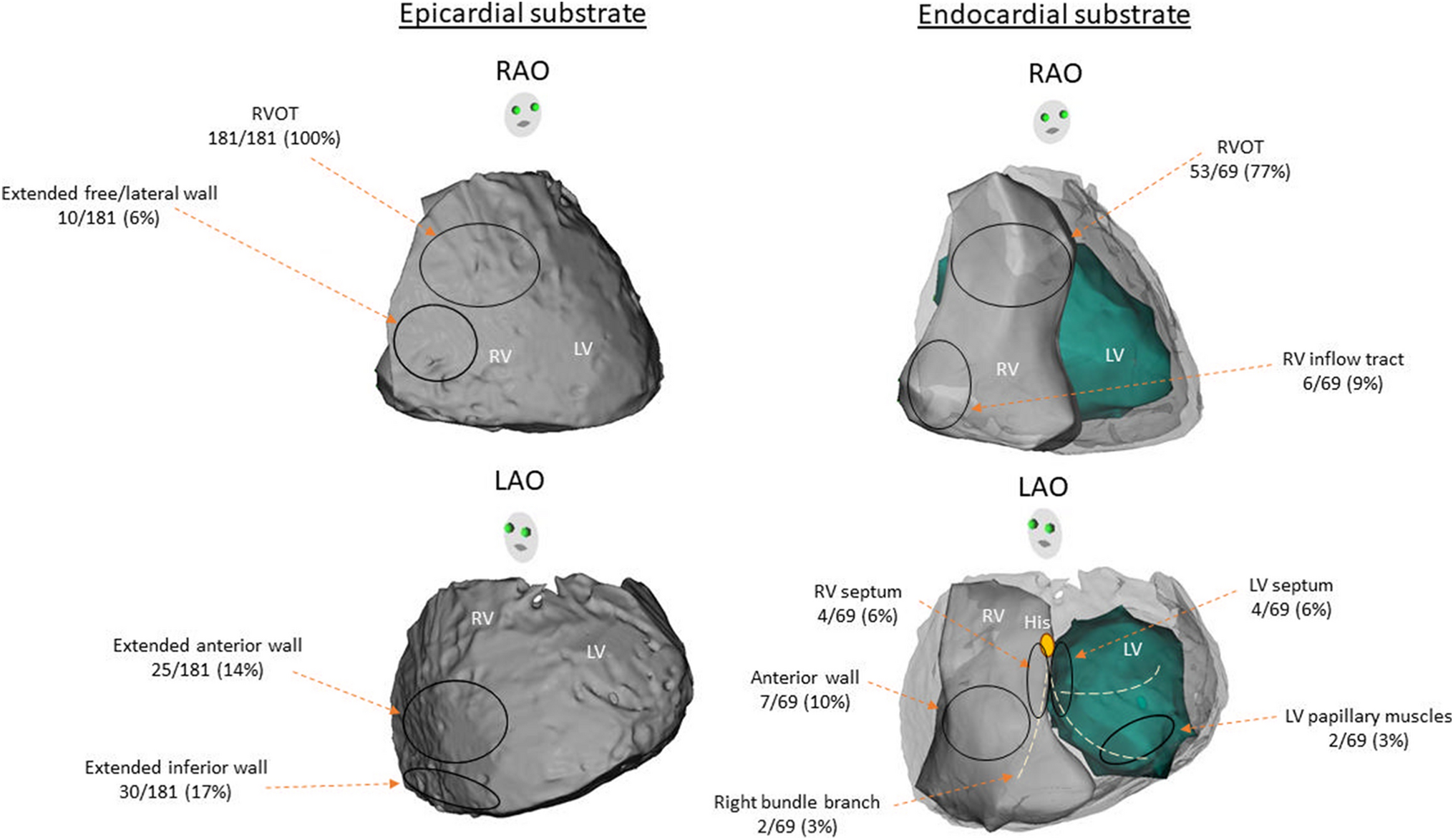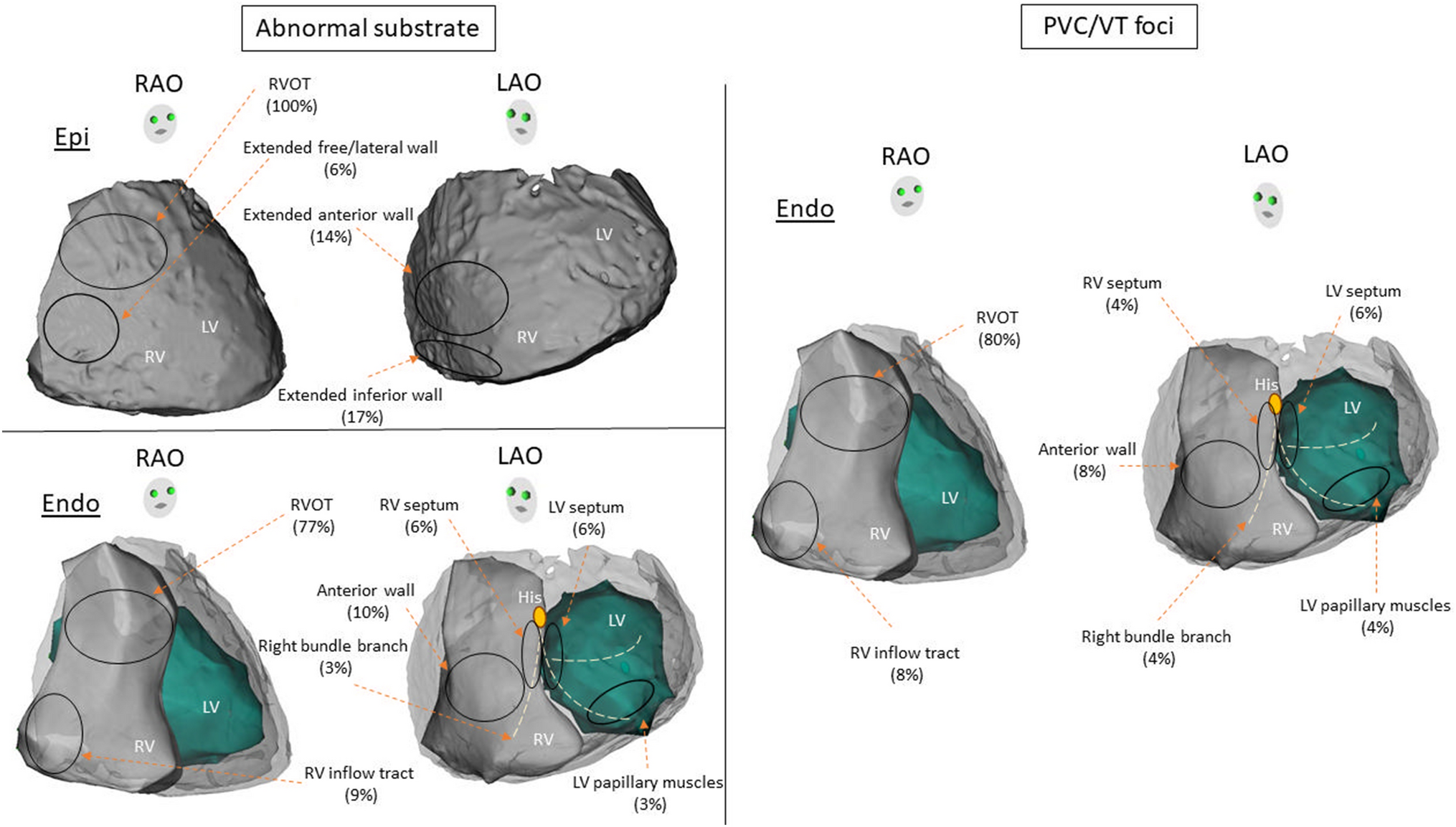 Almost all abnormal substrates were localized in epicardial RVOT with possible extension. Beyond RVOT in 6% of cases to the RV free wall, 14% to RV anterior wall, and 17% to RV inferior wall. In contrast, all PVC-triggered VF and sustained VTs were localized to endocardium RVOT with highly variable involvement of multiple regions among both RV and LV endocardium.