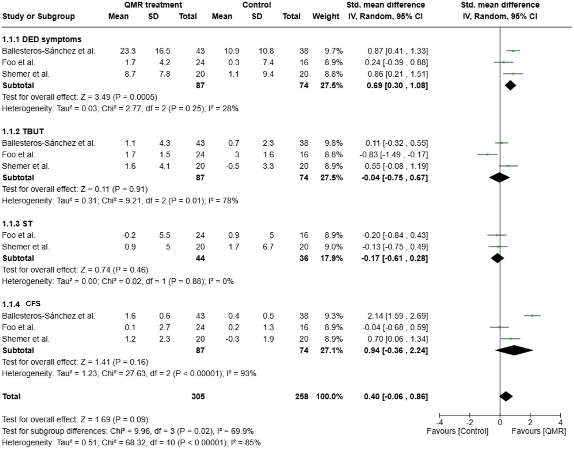 Shemer et al. [42] 2024 | Israel | • Double-masked • Monocenter | 1 | 40 | 63.5 ± 15.3 | 13/27 | 40 | • OSDI ≥ 13 points • TBUT ≤ 10 s • CFS ≥ 1 points | Four 20-min sessions of QMR (One per week) | Four 20-min sessions of Sham QMR (One per week) | No |