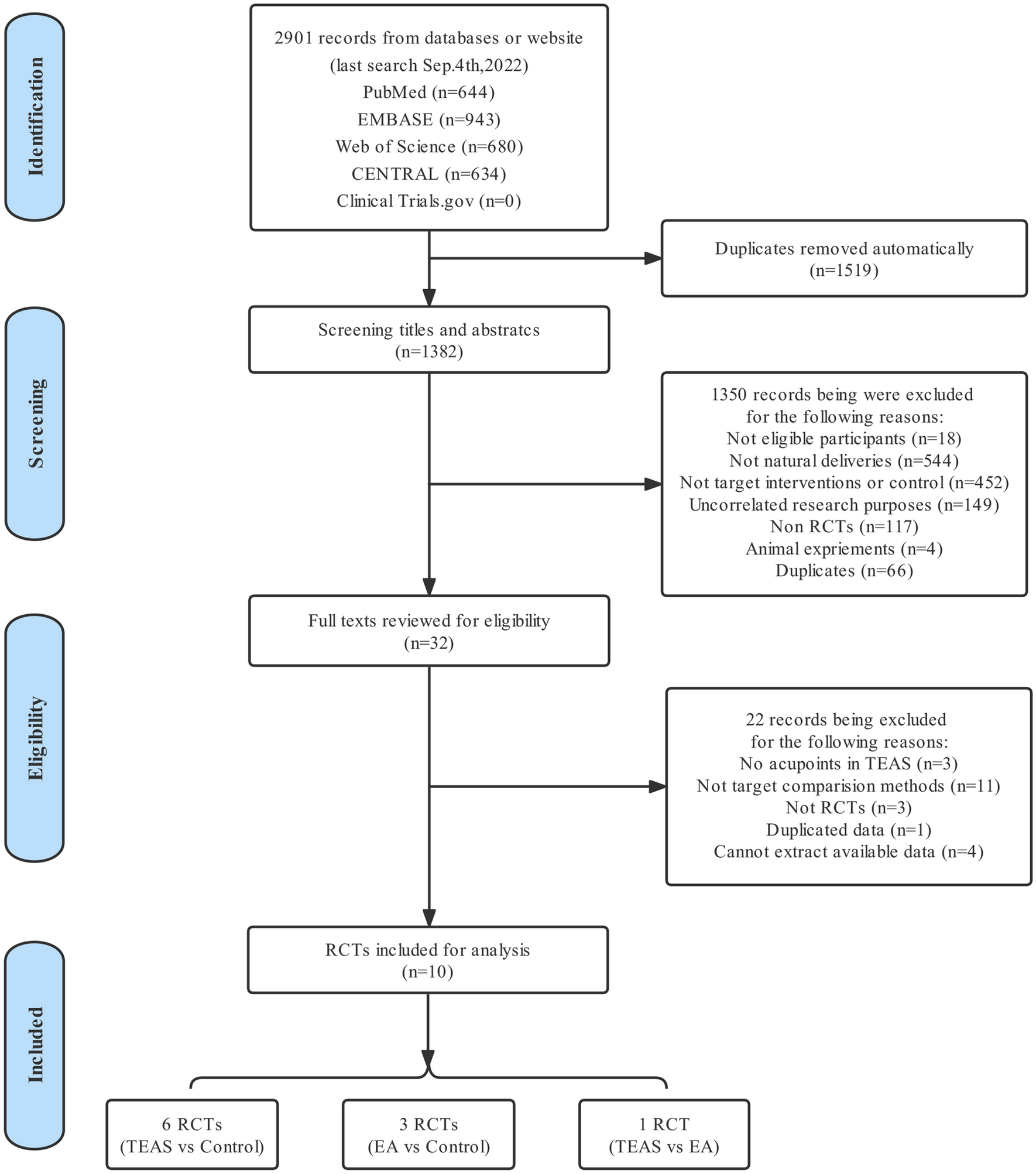 38]. Therefore, it is essential to explore a safe and effective intervention to relieve pain during delivery. In this study, we conducted an NMA to compare the efficacy and safety between two interventions, TEAS, a convenient and noninvasive analgesia therapy and EA, the most common therapy for relieving labor pain. Following strict screening, we identified ten RCTs eligible for our analysis [
