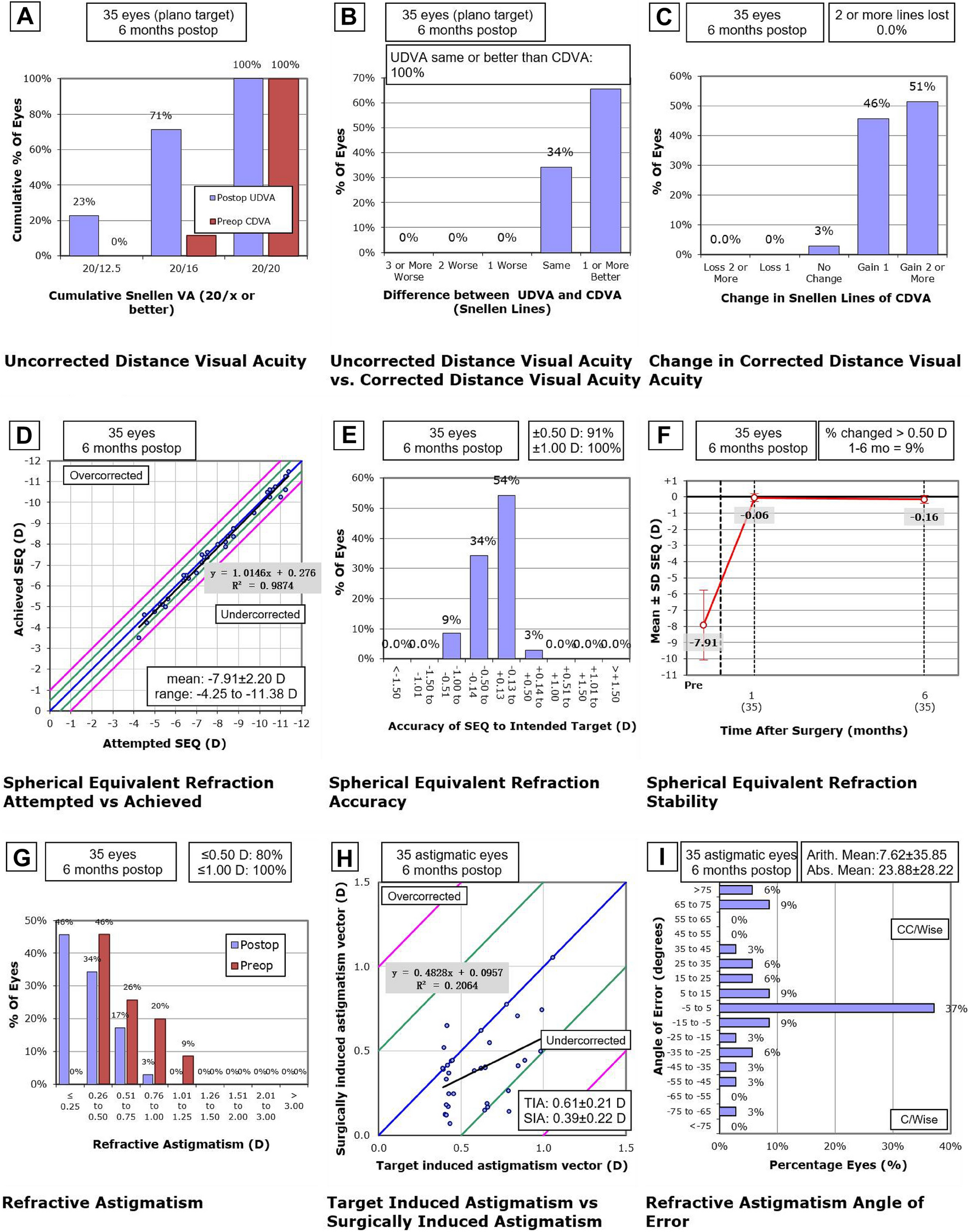 All patients underwent postoperative ocular examinations at 1 and 6 months after surgery. The following parameters were evaluated: uncorrected distance visual acuity (UDVA), corrected distance visual acuity (CDVA), manifest refraction, slit-lamp evaluation, intraocular pressure (IOP), corneal topography, and endothelial cell density. Vector analysis was performed for eyes with astigmatic correction using the Alpins method [