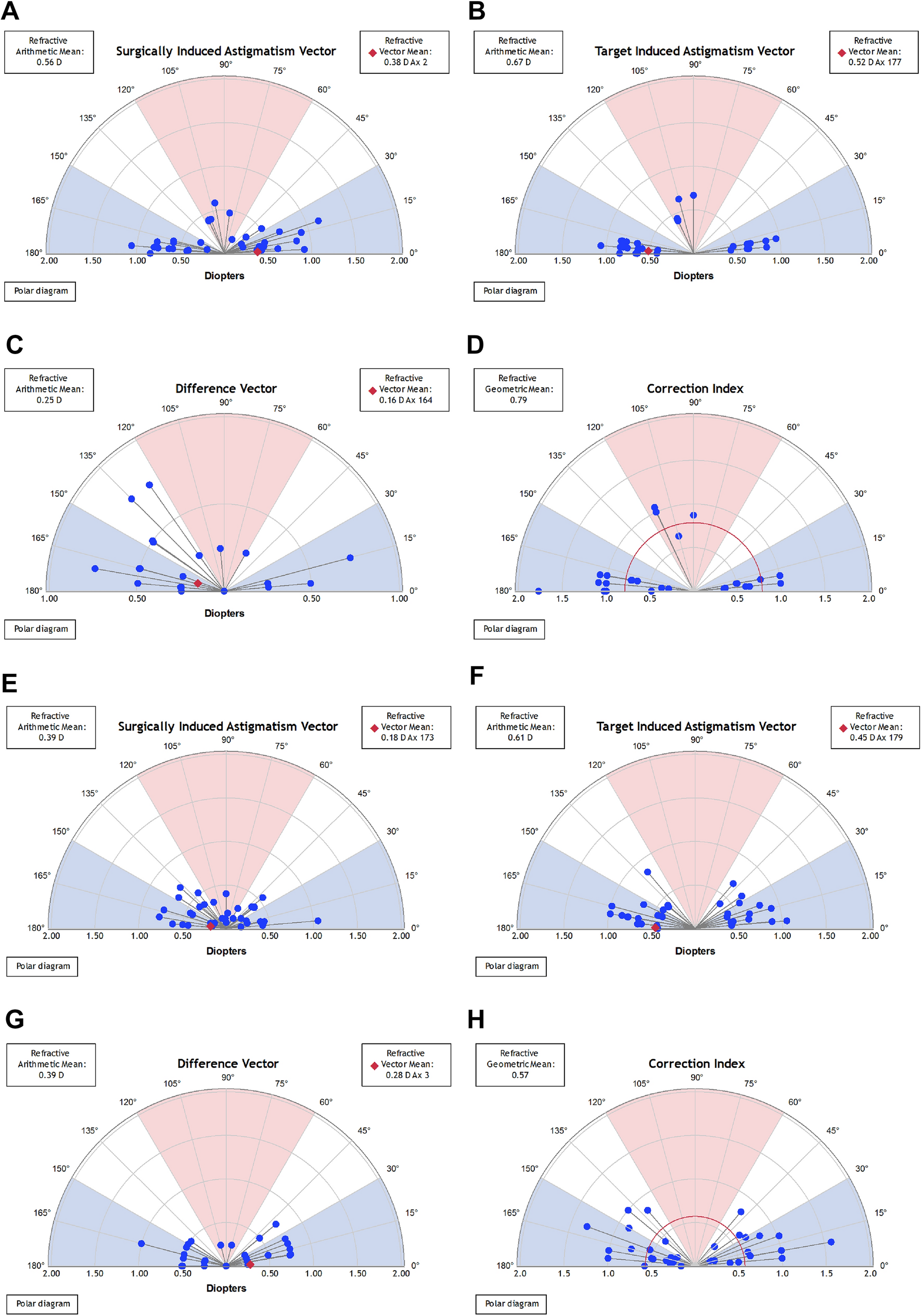 10]. As suggested by Alpins, the target-induced astigmatism (TIA), surgically induced astigmatism (SIA), difference vector (DV), magnitude of error (ME), angle of error (AE), correction index (CI), and index of success (IOS) were analyzed. Keratometric surgically induced astigmatism (SIA