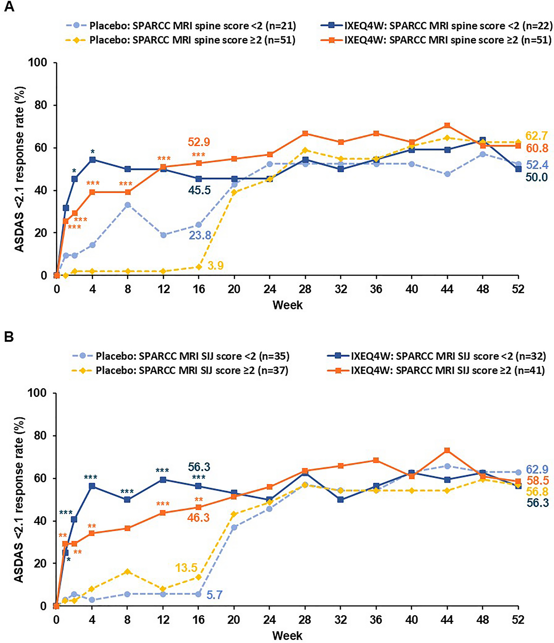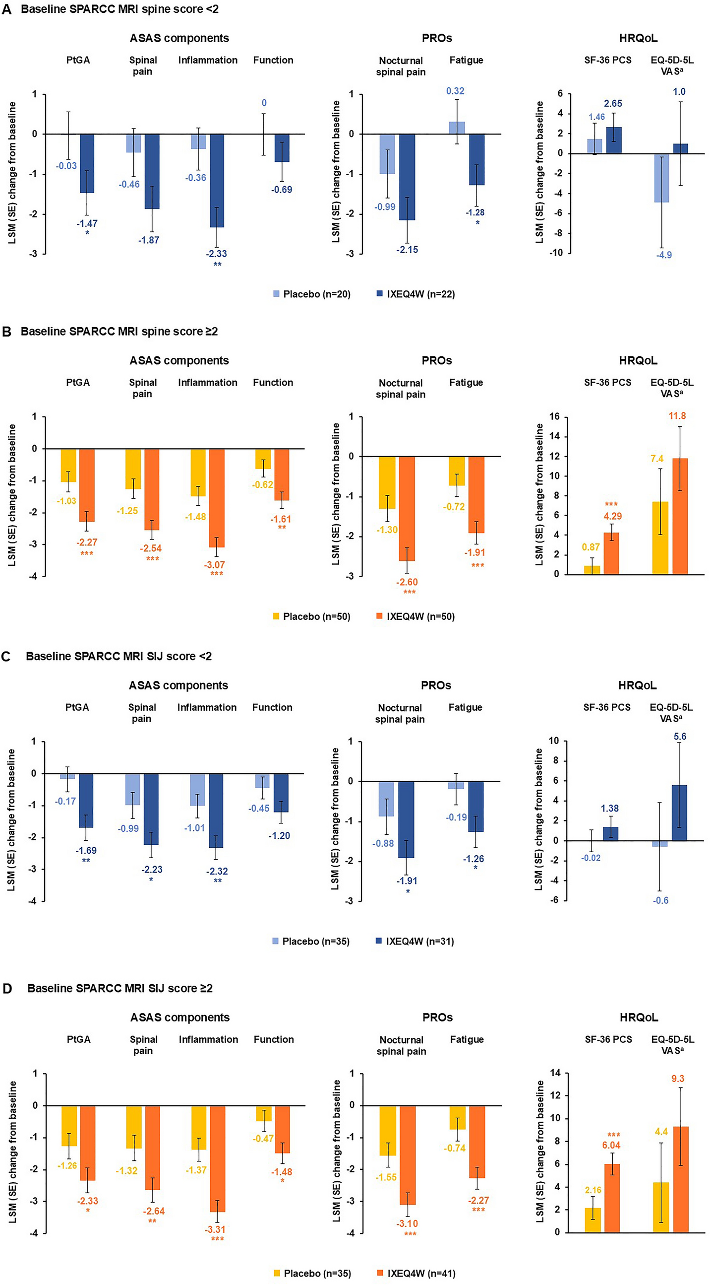 Baseline SPARCC MRI spine score < 2 | Baseline SPARCC MRI spine score ≥ 2 | Baseline SPARCC MRI SIJ score < 2 | Baseline SPARCC MRI SIJ score ≥ 2 | |||||