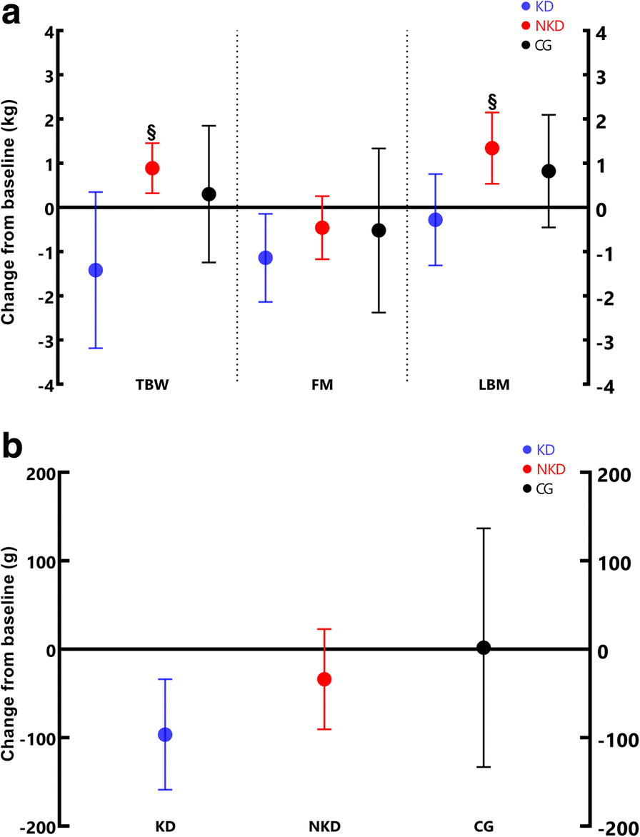 n = 26), during 11 weeks. These authors also found a decrease in FM in the KD group but, unlike our results, there was an increase in LBM.