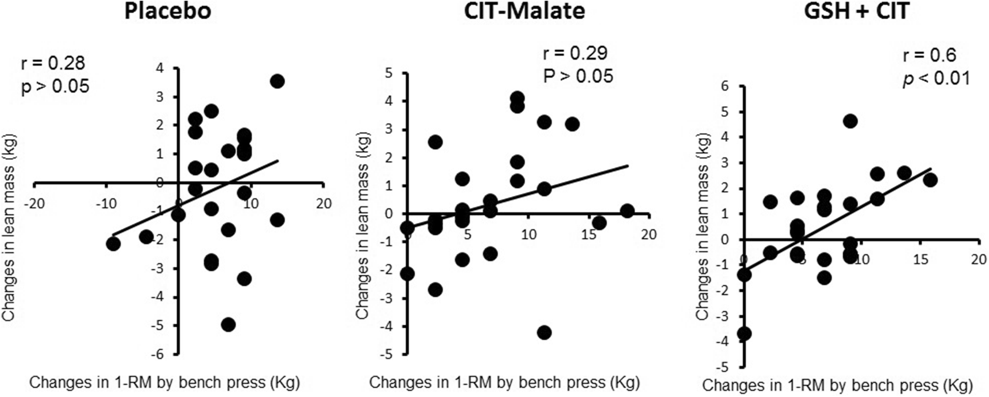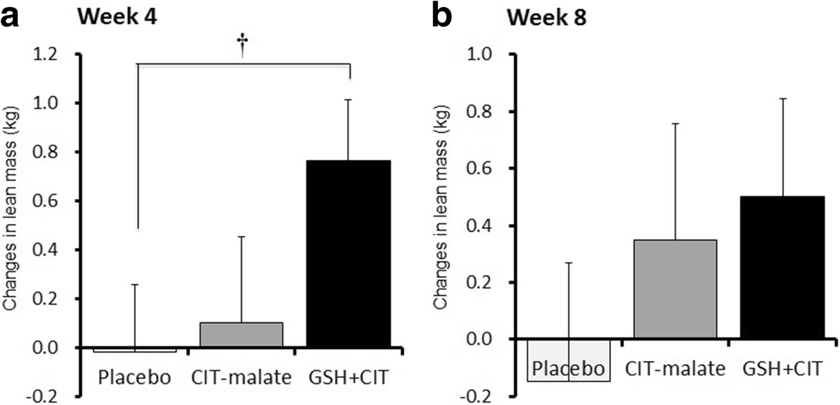 We did observe GSH + CIT to undergo significant increases in lean mass compared to placebo after 4 weeks. Additionally, a significant correlation between lean mass and muscle strength was observed in GSH + CIT, but not PLC and CIT-malate.
