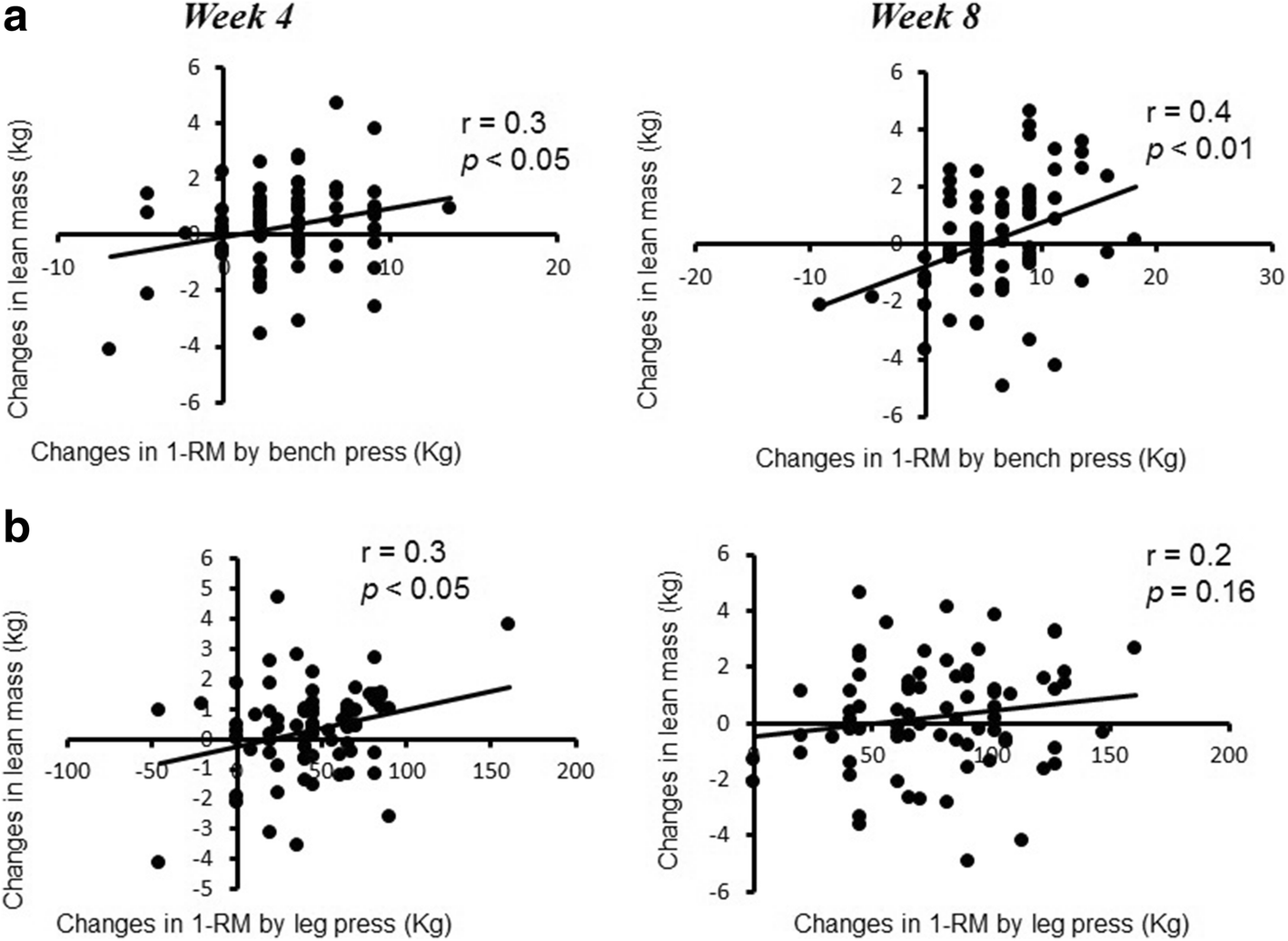 We attempted to equate training volume and expressed it relative to body mass so that we could better determine any preferential effects provided by the supplements relative to the association between lean mass and muscle strength and showed there to be no differences between groups for RT volume. Interestingly, we did show that a significant relationship existed between lean mass and strength at week 4 and 8 for the bench press exercise. Regarding lean mass and leg press strength, however, there was a significant relationship observed only at week 4. More specifically, we observed that, only for GSH + CIT, the increase in muscle strength was significantly correlated to the increase in lean mass for this group.