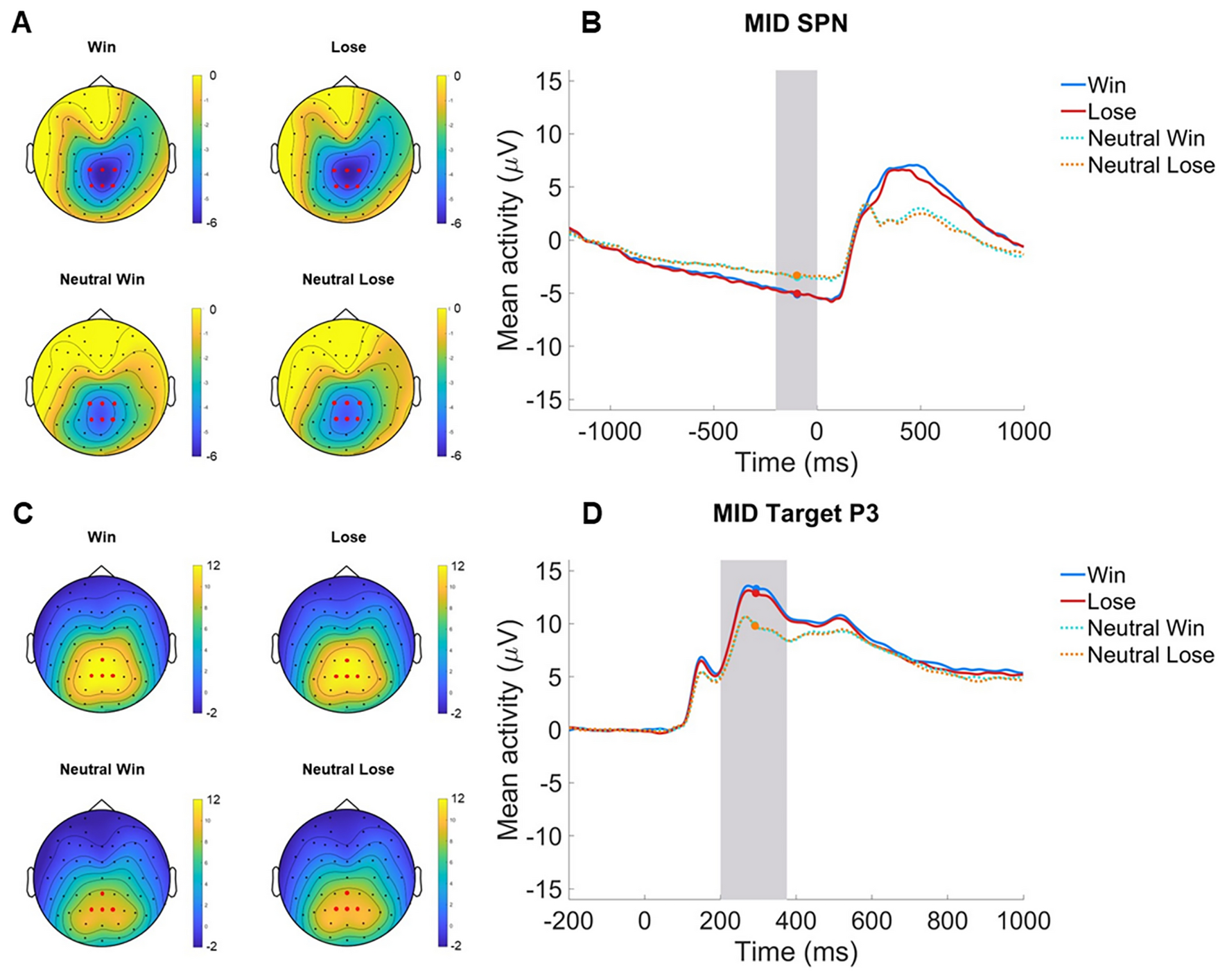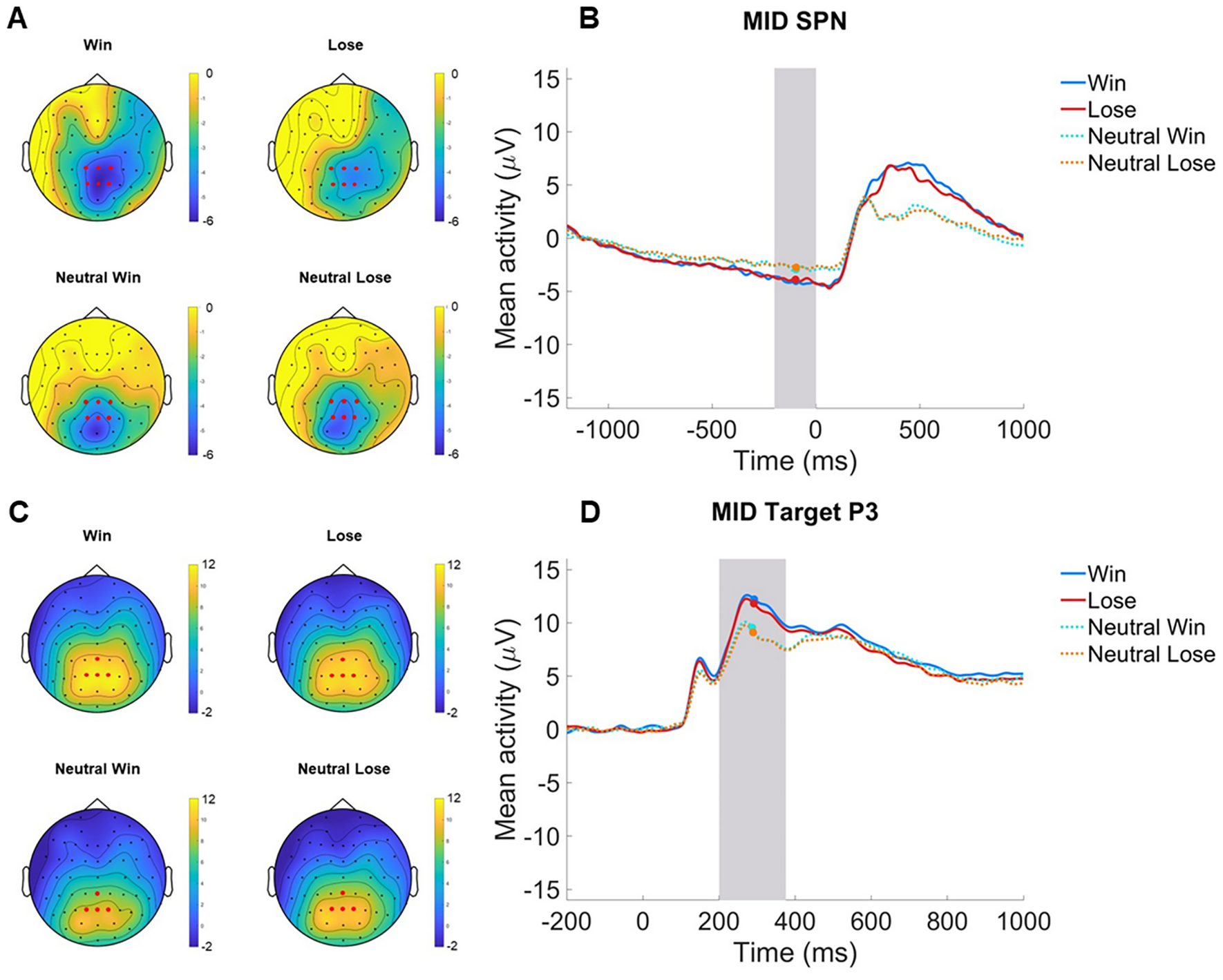 Across aims and analyses, the SPN factor – comprising SPN amplitude to lose, to win, to neutral lose, and to neutral win and indexing anticipatory attention to, or anticipation of, informational (correct or incorrect response) and motivational (loss or win) aspects of feedback [