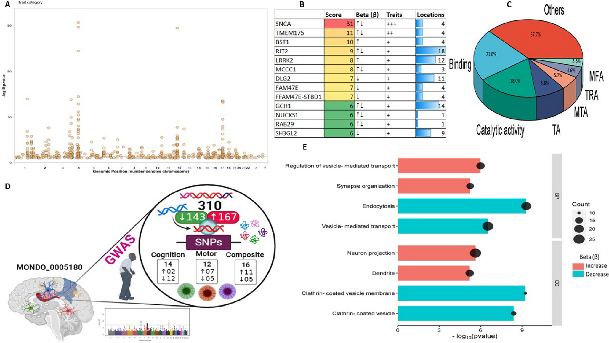 \(\downarrow\)rs7577851) contributed to disruptions in synaptic vesicle endocytosis, which play a substantial role in PD pathogenesis. Dysregulation of synaptic vesicle and synaptic adhesion pathways were also listed as the predominant pathways underlying the pathogenesis of PD. These findings suggest that targeting the