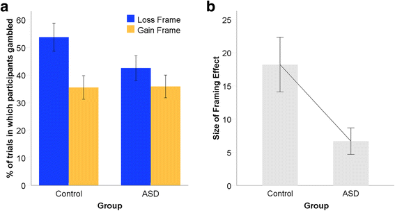 FEs were evident in both individuals with and without ASD, as demonstrated by the greater percentage of trials in which participants chose the gamble option in the loss than gain frame (Fig. 2a). However, the size of the FE (i.e., the difference between gambling in the Loss compared with Gain Frame) was substantially smaller and less variable in the ASD compared with the control group (Fig. 2b).