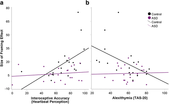 Moderation and within-group analyses demonstrated a striking difference between the relative impact of alexithymia and interoceptive ability on the ASD and control groups. For individuals without ASD, IA and alexithymia both significantly predicted the size of the FE, such that better interoception (and lower trait alexithymia) was associated with a larger FE. This result is in accordance with the model forwarded by De Martino and colleagues [2] in which emotional information influences decision-making in neurotypical individuals, and the extent to which one can accurately perceive emotional information/arousal determines the influence it has on decision-making (see also [13]). In contrast, alexithymia and interoception did not predict susceptibility to the FE in those with ASD. This differential pattern of results in people with and without ASD indicates the use of different strategies when making judgments: one strategy involving gist-based, fuzzy, intuitive processes used by non-autistic individuals, and another strategy which recruits rule/verbatim-based analysis which is recruited by individuals with ASD (see [59] for a neurodevelopmental perspective). These results are consistent with the idea that, instead of using interoceptive or emotional information, and regardless of whether they have access to these signals, individuals with ASD use a rule-based strategy which results in a smaller FE at the group level (see [60]). These results, in line with our predictions, are consistent with recent research showing divergent roles of autism and alexithymia across high-level judgment and decision-making tasks that invoke emotional processing [37‐39].