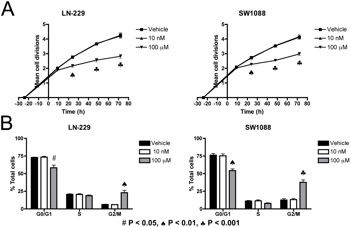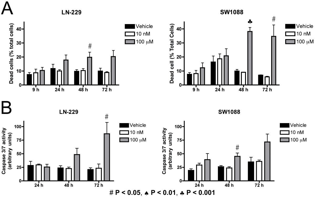 LN-229 and SW1088 cells were treated with vehicle, 10 nM or 100 μM A-192621 for 12 h and total RNA was prepared using the RNeasy Plus Mini Kit (Qiagen, Valencia, CA, USA). The quality of the samples was checked using the RNA 6000 Nano LabChip kit (Agilent Technologies, Santa Clara, CA, USA). RNA samples were then processed according to the Affymetrix Eukaryotic Sample and Array Processing protocol. Hybridization of the in vitro amplified RNA to Affymetrix Human Genome U133Plus 2.0 chips (Affymetrix, Inc., Santa Clara, CA, USA), washing and scanning of the arrays were performed following standard Affymetrix protocols using a Hybridization Oven 640, a Fluidics Station 450, and a GeneChip® Scanner 3000 7G. The raw data (*.cel files) from the Affymetrix hybridizations were processed and analyzed using Resolver (Rosetta Biosoftware, Seattle, WA, USA). Genes were identified using cutoffs of fold-change > 3 and p < 0.0001.
