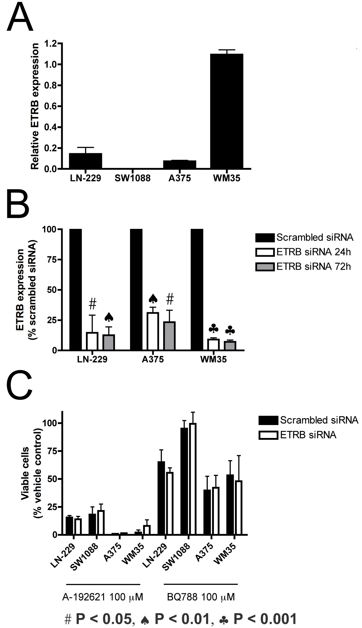 in vitro viability by A-192621 and BQ788 is not dependent on ETRB expression. This conclusion is supported by three types of data. (1) The concentrations of ETRB antagonists required to reduce cell number are far above the concentrations required to displace ET-1 from ETRB. (2) At the high dose, A-192621 reduces cell viability in the glioma cell line SW1088 despite the absence of detectable ETRB expression in these cells. (3) Experimental reduction of ETRB expression in the other cell lines by >90% has no effect on the ability of either antagonist to reduce glioma or melanoma cell numbers