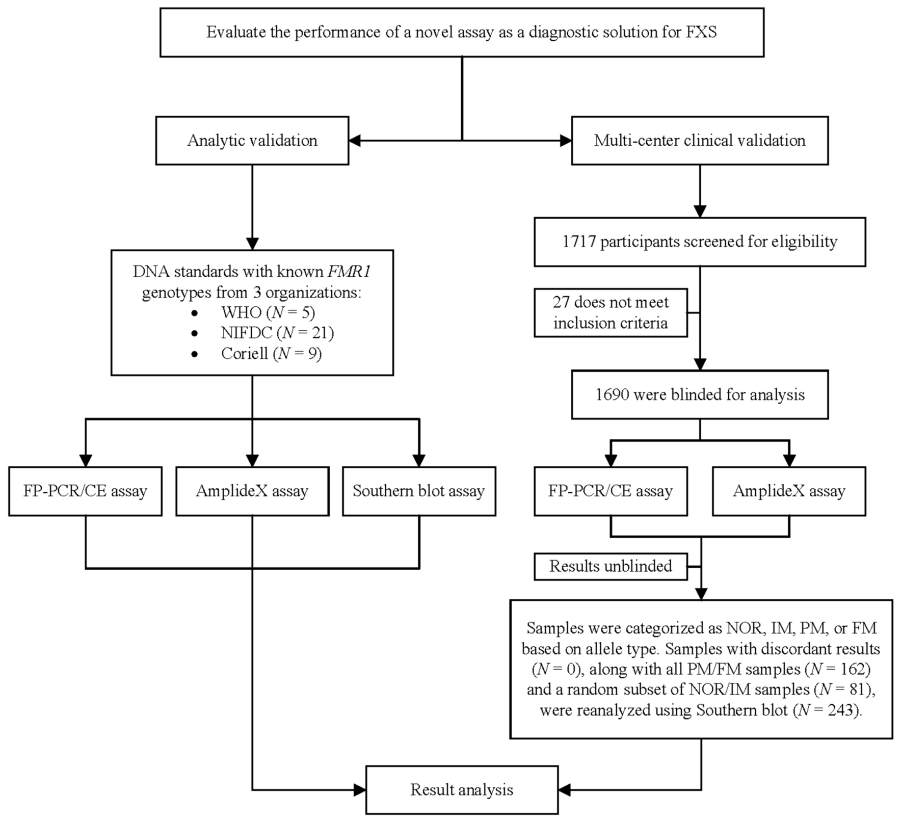 Study flowchart. FXS fragile X syndrome, WHO World Health Organization, NIFDC National Institute of Food and Drug Control, Coriell Coriell Institute for Medical Research, FP-PCR/CE four-primer FMR1 PCR/capillary electrophoresis assay, NOR normal, IM intermediate, PM premutation, FM full mutation