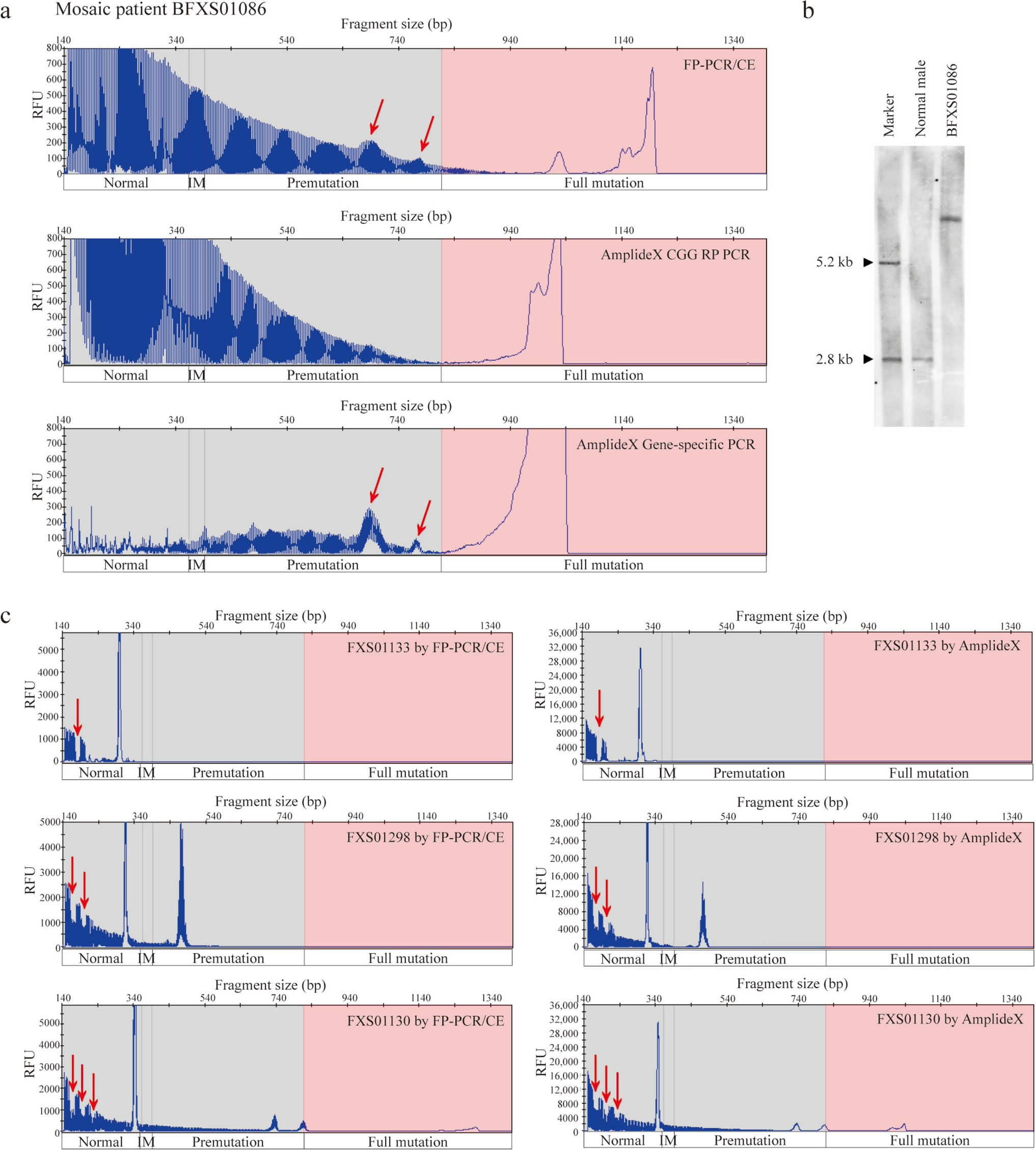 Clinical performance of the FP-PCR/CE compared to AmplideX and Southern blot. a Detection of a mosaic participant (BFXS01086) by FP-PCR/CE, AmplideX CGG RP PCR and AmplideX Gene-specific PCR. The arrowhead highlighted the mosaic peak; b Southern blot results from a normal male and the mosaic participant (BFXS01086); c Detection of AGG interruptions in participants FXS01133/FXS01298/FXS01130 by FP-PCR/CE and AmplideX. Arrowheads indicated the location of AGG interruptions. IM intermediate, RFU relative fluorescence units