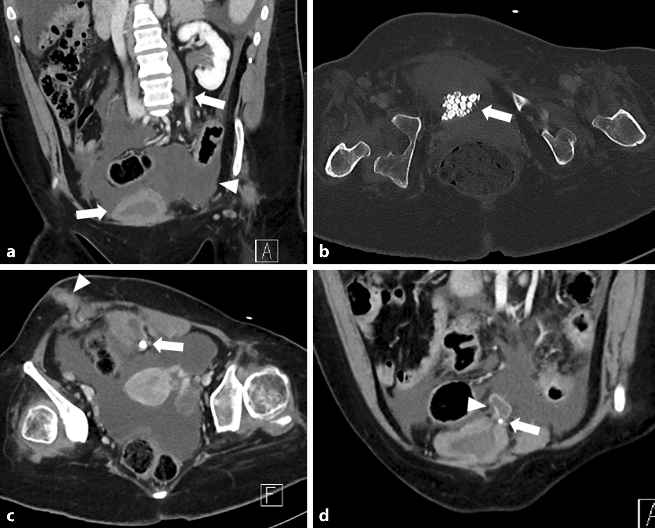 Computertomographie (CT) des Abdomens mit Kontrastmittel in portalvenöser Phase in koronarer (a, d) und axialer (b, c) Rekonstruktion (a, c, d Weichteilfenster, b Knochenfenster). a Es zeigt sich im Unterbauch die zirkulär wandverdickte Harnblase und der kontrastmittelaufnehmende Ureter links (Pfeile). Zudem ist reichlich Flüssigkeit im Unterbauch und ein verdicktes, kontrastmittelaufnehmendes Peritoneum zu erkennen (Pfeilspitze). b Innerhalb der Blase finden sich multiple röntgendichte Konkremente (Pfeil). c Die Blase zeigt ein nach links kranial gerichtetes Divertikel mit einem darin befindlichen Konkrement (Pfeil). Die Ausleitung des Mitrofanoff-Stoma im rechten Unterbauch ist verdickt und nimmt Kontrastmittel auf (Pfeilspitze). d Abgebildet ist erneut die wandverdickte Blase mit dem nach links kranial gerichteten Divertikel und dem teilweise erfassten Konkrement (Pfeil). Die Wand des Divertikels zeigt eine Konturunterbrechung (Pfeilspitze)