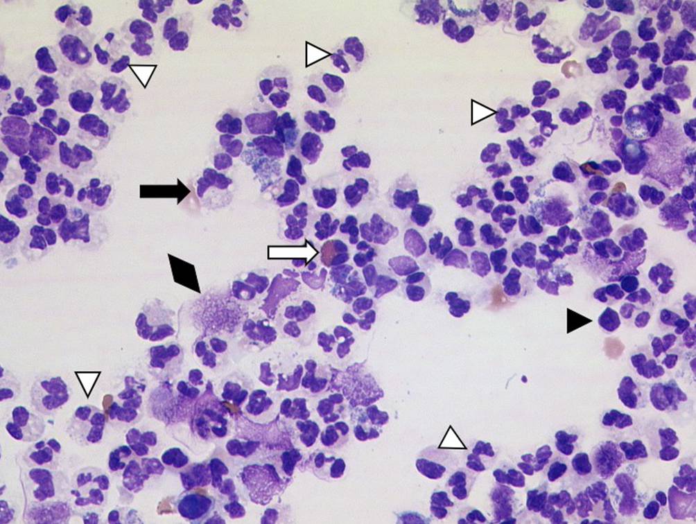 Aszitespunktat mit einem hochfloriden entzündlichen Zellbild mit zahlreichen neutrophilen Granulozyten (weiße Pfeilspitzen), einzelnen eosinophilen Granulozyten (weißer Pfeil), Lymphozyten (schwarze Pfeilspitze), Makrophagen (schwarzer Pfeil) und zerfallenden Leukozyten (schwarze Raute). Zytospinpräparat, MGG-Färbung, Originalvergrößerung 400:1