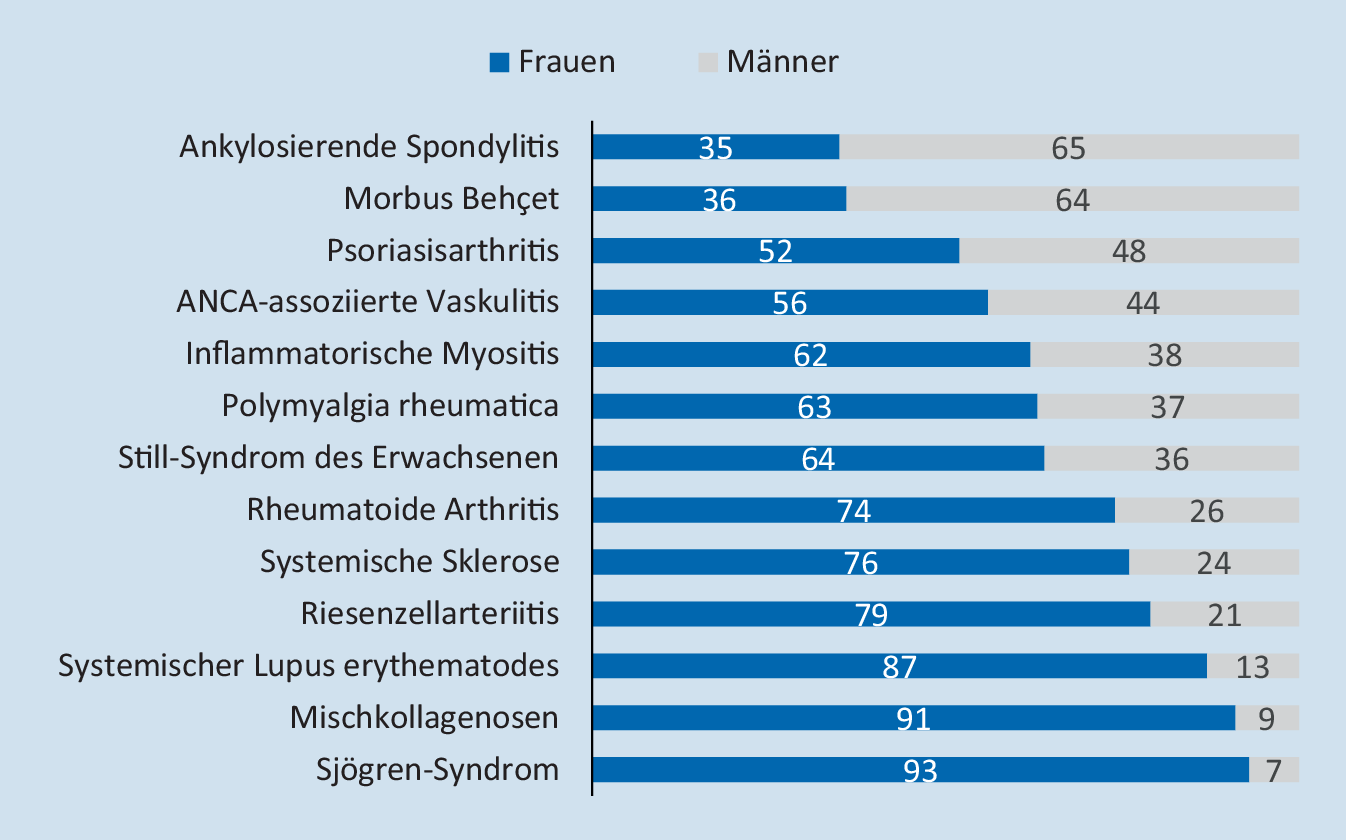 Bei den meisten, aber nicht bei allen rheumatischen Erkrankungen überwiegt – mit unterschiedlicher Ausprägung – der Anteil an Frauen (Abb. 1). Vor allem Kollagenosen wie das Sjögren-Syndrom, der systemische Lupus erythematodes oder die systemische Sklerose, aber auch die rheumatoide Arthritis (RA) entstehen häufiger bei Frauen, während die Geschlechterverteilung etwa bei Psoriasisarthritis ausgewogen ist. Durch die Erweiterung der Klassifikationskriterien für axiale Spondyloarthritiden auf Formen ohne sichtbare radiologische Veränderungen (sogenannte nichtradiologische Spondyloarthritis) hat sich das Geschlechterverhältnis bei der Gesamtgruppe der axialen Spondyloarthritis zwischen Frauen und Männern angeglichen, während sich die durch radiologische Veränderungen definierte ankylosierende Spondylitis häufiger bei Männern manifestiert [2]. Auch der Morbus Behçet tritt häufiger bei Männern auf.