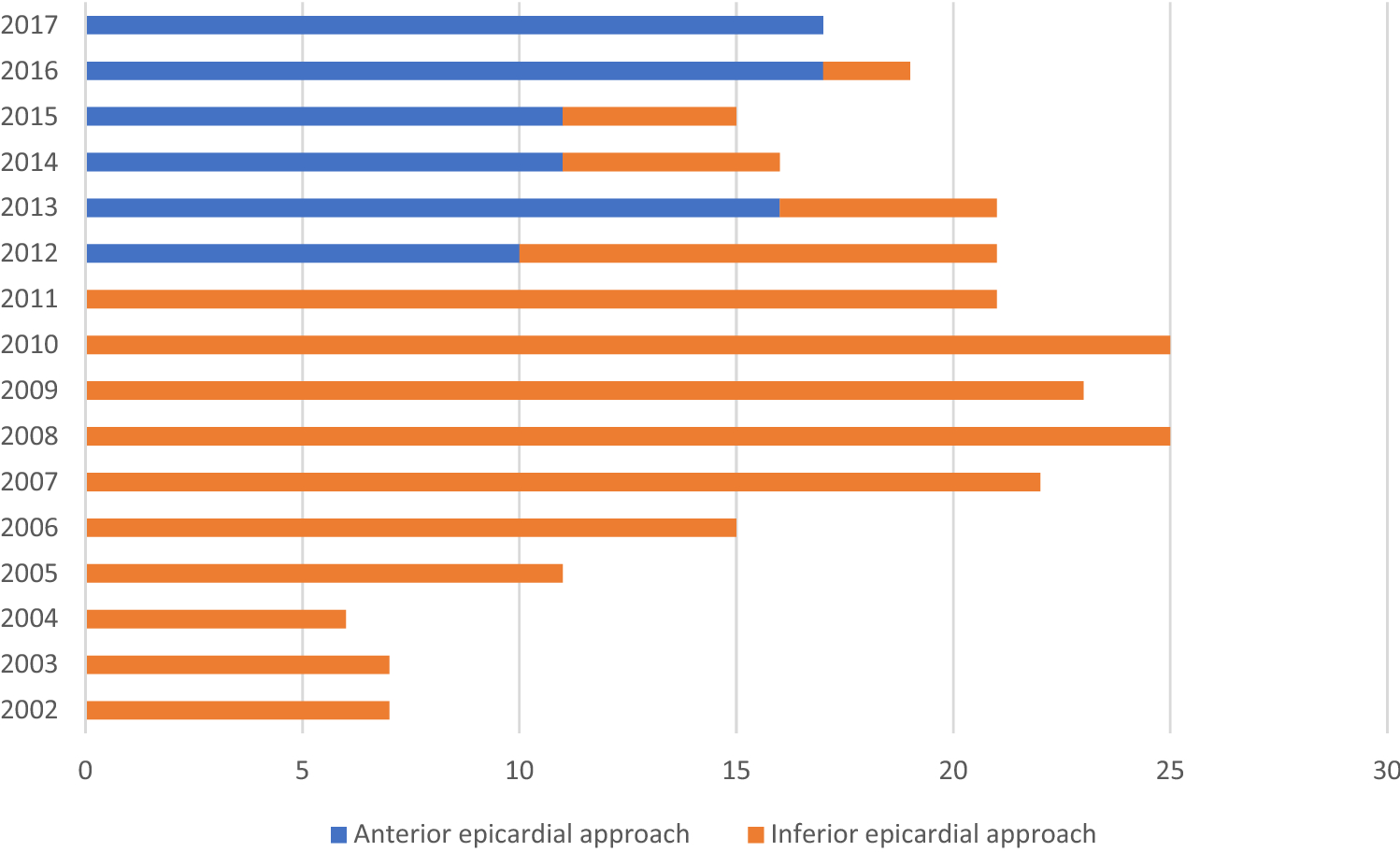 21]. These complications were mainly observed while performing an AP-guided inferior-oriented puncture approach. In our cohort the incidence of major complications was 10.1% when performing an inferior epicardial approach. Comparison between the above-mentioned studies and our results are difficult since most reports did not differentiate explicitly between puncture-related and overall procedural complications. However, we also observed a not negligible number of severe abdominal collateral damages. In 5 patients (2.6%) perforations or accidental punctures of the liver, colon or gastric vessels occurred with the necessity of emergent surgery. We did not observe these complications at all when performing an anterior epicardial access approach with additional LAO 90° fluoroscopical guidance. There might be different reasons for this observation: First, during anterior epicardial access approach the needle is advanced right below the sternum after subxiphoidal puncture in a shallow angle. Therefore, it may enter the fibrous pericardium without penetrating the diaphragm with a lower risk of vessel injuries on the one hand, and without any other adjacent organs on the „pathway “ between the subxiphoid puncture side and pericardial access side (Fig.