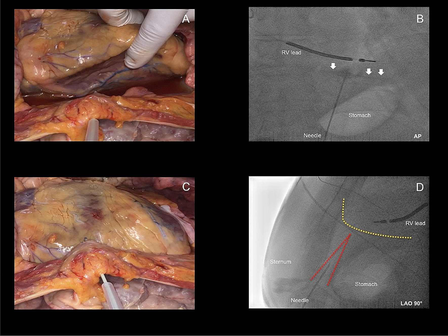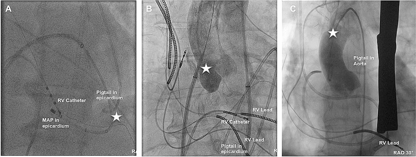 24]. A LAO guided anterior-oriented puncture technique performed with a micropuncture needle might be a beneficial combination to prevent RV puncture, even though radiation exposure is particularly high for the operator when using a LAO 90° angulation.