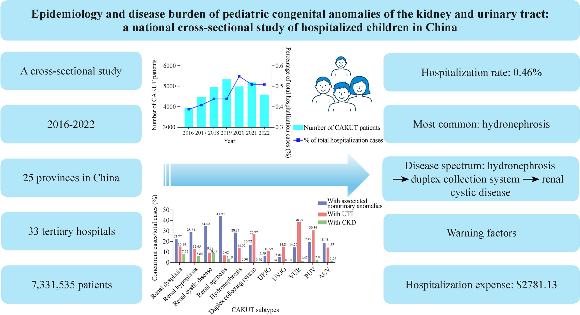 The most common CAKUT subtype is hydronephrosis. The disease spectrum of CAKUT was different in different age groups, which gradually evolved from hydronephrosis to duplex collection system and renal cystic disease. UTI, associated nonurinary congenital anomalies and low birth weight are the warning factors for CAKUT. The cost burden and fatality rate of CAKUT is low. Strengthening the management of CAKUT and appropriate intervention is expected to obtain a good prognosis and improve quality of life.