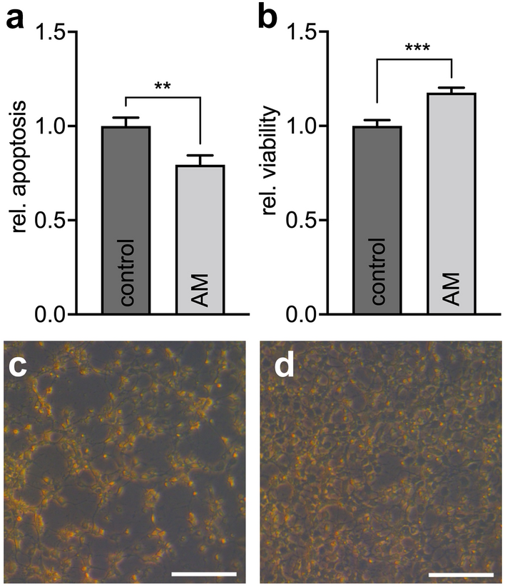 To rule out toxic effects, cellular apoptosis was examined after incubation with AM by measuring histone–DNA complexes in accordance with the manufacturer’s instructions (cell death detection ELISA, Merck). In brief, 20,000 differentiated 661W cells/well as well as 10,000 ARPE-19 or Mio-M1 cells/well were incubated in serum-free cell culture medium with or without AM for 24 h or 72 h, respectively. After treatment, the cell culture medium was centrifuged, and histone–DNA fragments were detected by ELISA using an ELISA plate reader (Molecular Devices) at 405 nm.