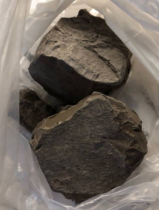 Im Rahmen einer Pubmed-Recherche sind wir auf die mögliche Ursache Geophagie gestoßen und stellten der Patientin die Frage, ob sie möglicherweise Tonerde zu sich nehme. Sie reagierte völlig ruhig und bejahte. Sie zog aus ihrer Handtasche einen Beutel hervor, in welchem sich 3 große Stücke Tonerde mit einer Größe von ca. 7 × 5 cm befanden (Abb. 1). Als Grund für die Tonerdeeinahme gab sie die Schwangerschaftsübelkeit und das Sodbrennen an.