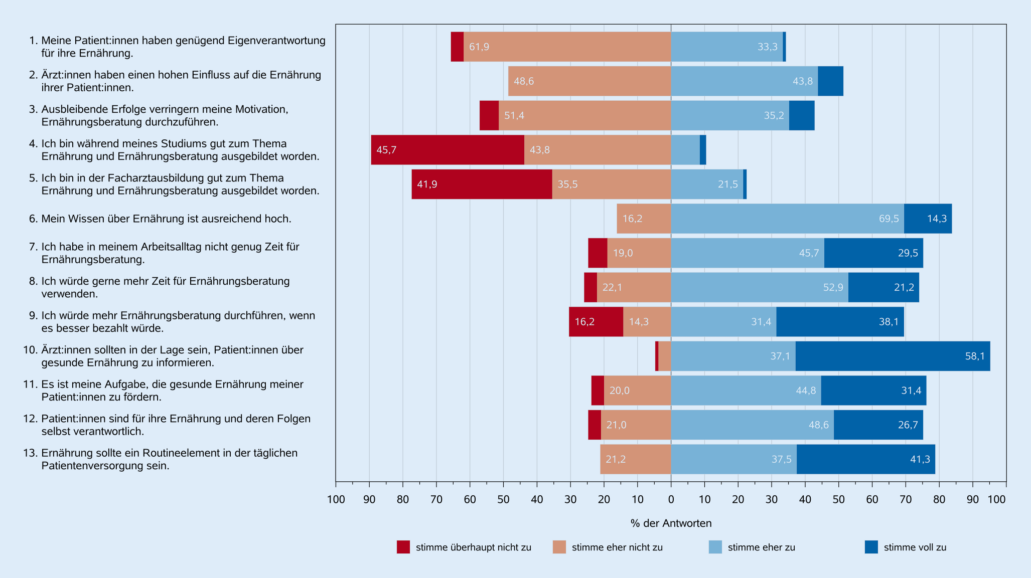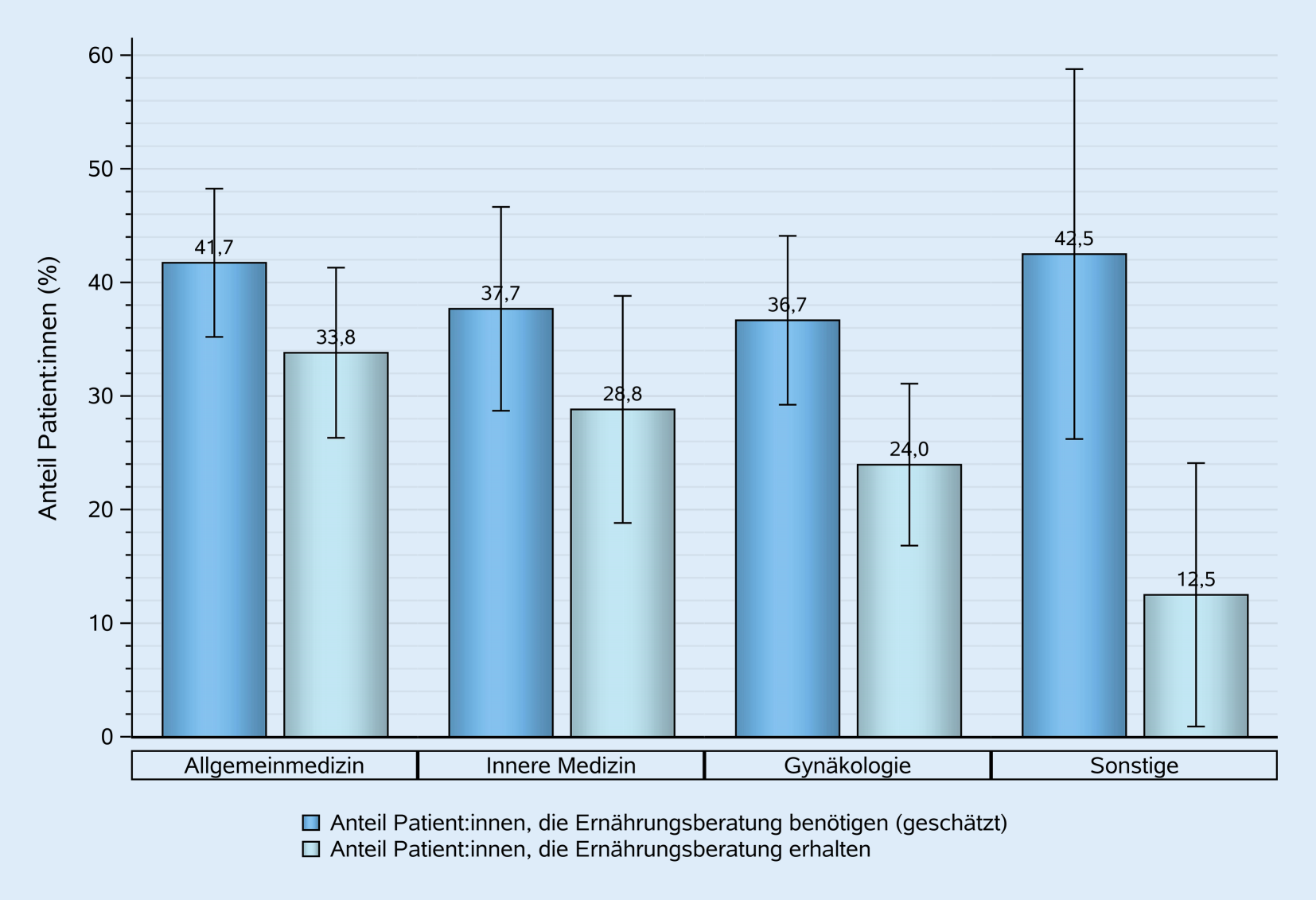 Die Ärzt:innen schätzten, dass durchschnittlich 39,5 % ihrer Patient:innen eine Ernährungsberatung benötigten, mit einer großen Spannweite von 5–100 %. Allgemeinmediziner:innen schätzten den Anteil auf durchschnittlich 41,7 %, Internist:innen auf 37,7 %, Gynäkolog:innen auf 36,7 % und Sonstige auf 42,5 %.