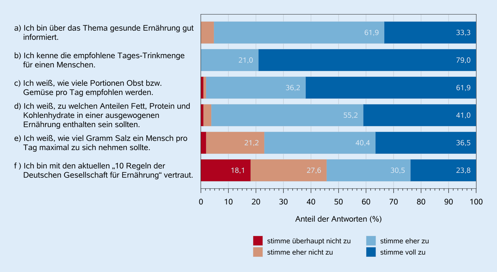 Da durch die postalische Rücksendung der Fragebögen Anonymität gewährleistet war, können wir davon ausgehen, dass die Antworten unverfälscht und wahrheitsgemäß waren. Dennoch beruht die Studie auf Selbstauskünften, die anfällig für Verzerrungen sein können. Dies zeigt sich bei den Fragen zum selbst eingeschätzten Ernährungswissen der Teilnehmenden, das möglicherweise überschätzt wurde: Mehr als 30 % der Teilnehmenden stimmten zu Beginn des Fragebogens der Aussage, gut über Ernährung informiert zu sein, voll zu. Am Ende des Fragebogens, nachdem weitere Fragen zu Wissen und Ernährungsberatung beantwortet wurden, stimmten weniger als 15 % einer ähnlichen Aussage voll zu.